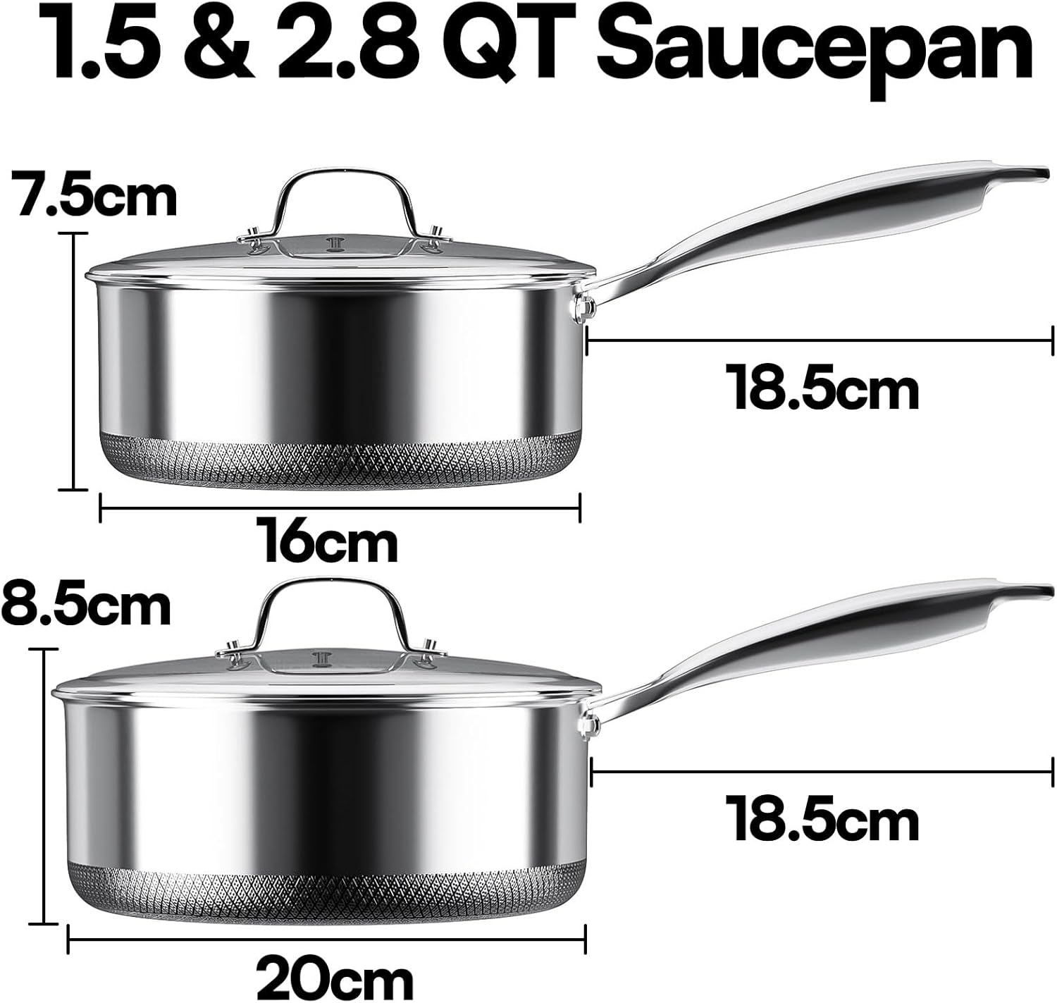 【5-Ply Build & Safe Non-Toxic】: 5 premium layers & precision bottom: magnetic steel (induction-ready), aluminum core (even heat), 18/8 stainless steel (safe/durable), scratch-resistant micro-engraved surface, top non-stick coating. Our stainless steel saucepan with lid is free of PTFE/PFOA/PFAS/PFOS/Cd/Pb; prevents sticking (eggs/sauces/meats), cuts oil for health, scratch resistant, easy to clean.