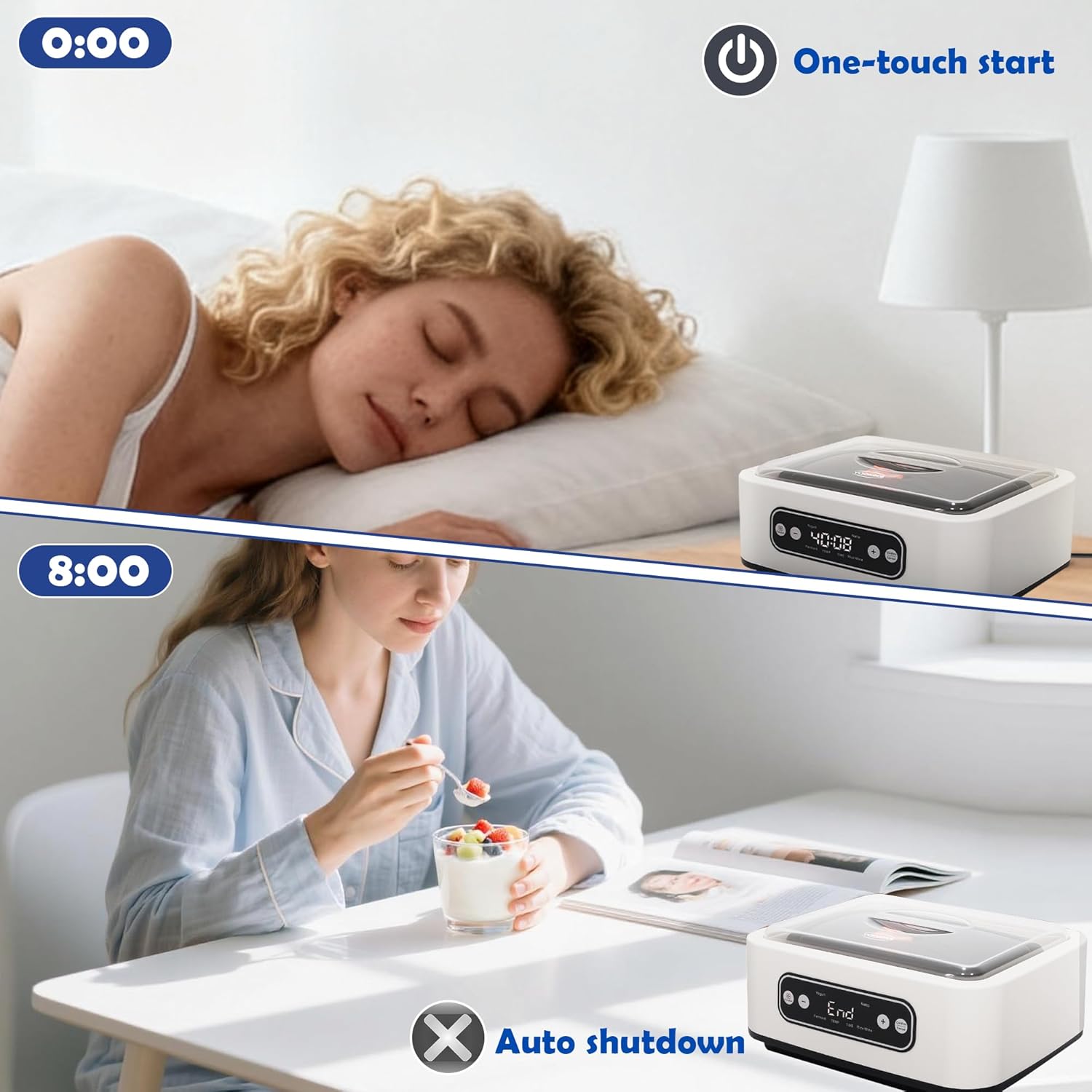 8+16 intermittent fasting is a popular dietary approach worldwide for managing weight, controlling blood sugar levels, and improving metabolic health. It involves having only 8 hours for eating each day, with the remaining 16 hours being a fasting period. If you are following this eating habit, you might feel frustrated about not being able to have breakfast. With this yogurt maker, you won’t have to worry anymore, because during the 16-hour fasting period, drinking water, black coffee, and eating nuts or unsweetened yogurt is allowed. Unsweetened yogurt is very low in calories, and consuming it in moderation won’t interrupt autophagy. Our fully automatic yogurt maker can run while you sleep and automatically stop when finished. With it, you no longer have to go to work on an empty stomach in the morning.