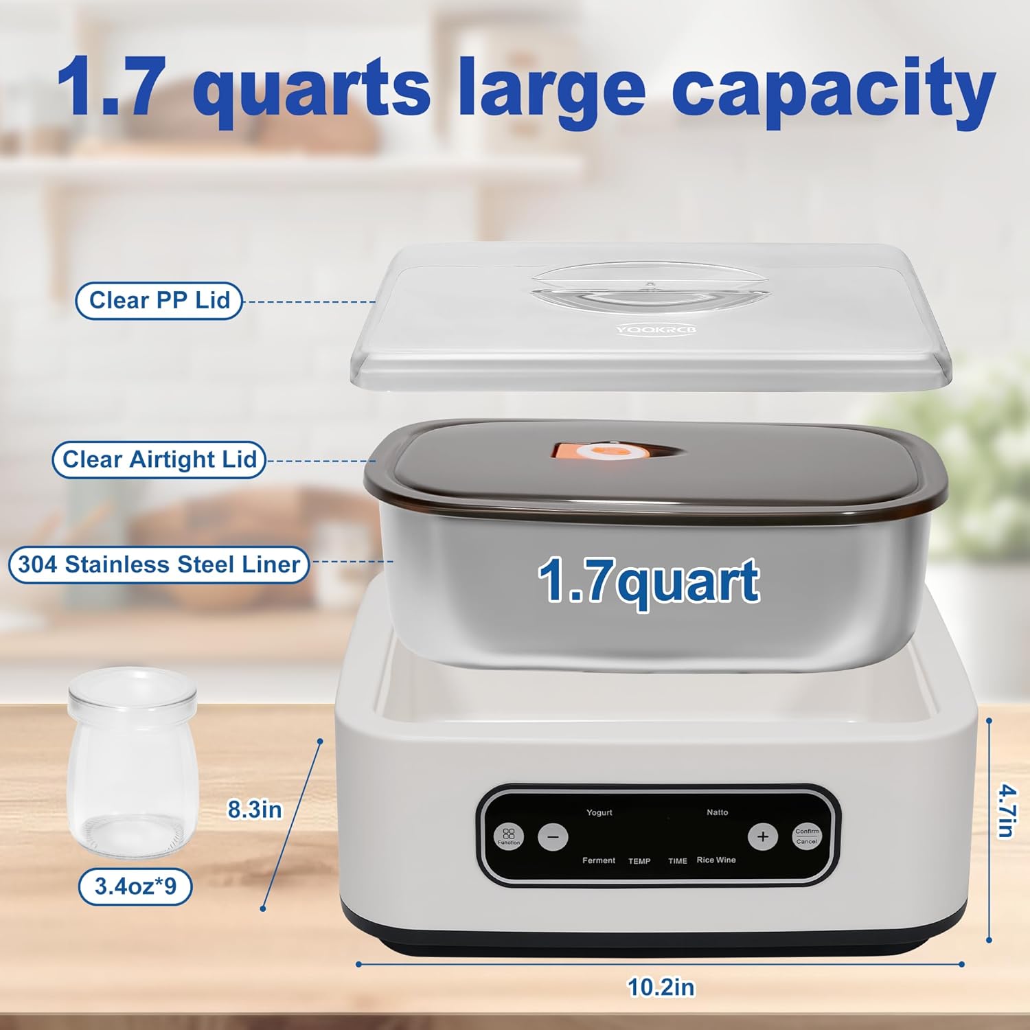 🥛𝟏.𝟕-𝐐𝐮𝐚𝐫𝐭 𝐂𝐚𝐩𝐚𝐜𝐢𝐭𝐲: To maximize space, we’ve designed this yogurt maker with a square inner pot that complements the overall appearance and ensures even heat distribution. The 1.7-quart capacity is almost the largest single yogurt containers you’ll find. Made of 304 food-grade stainless steel, it’s easy to clean and durable—unlike glass containers. The lid is made of BPA-free polypropylene (PP), which is heat-resistant, chemically resistant, and the yogurt does not contact any plastic.