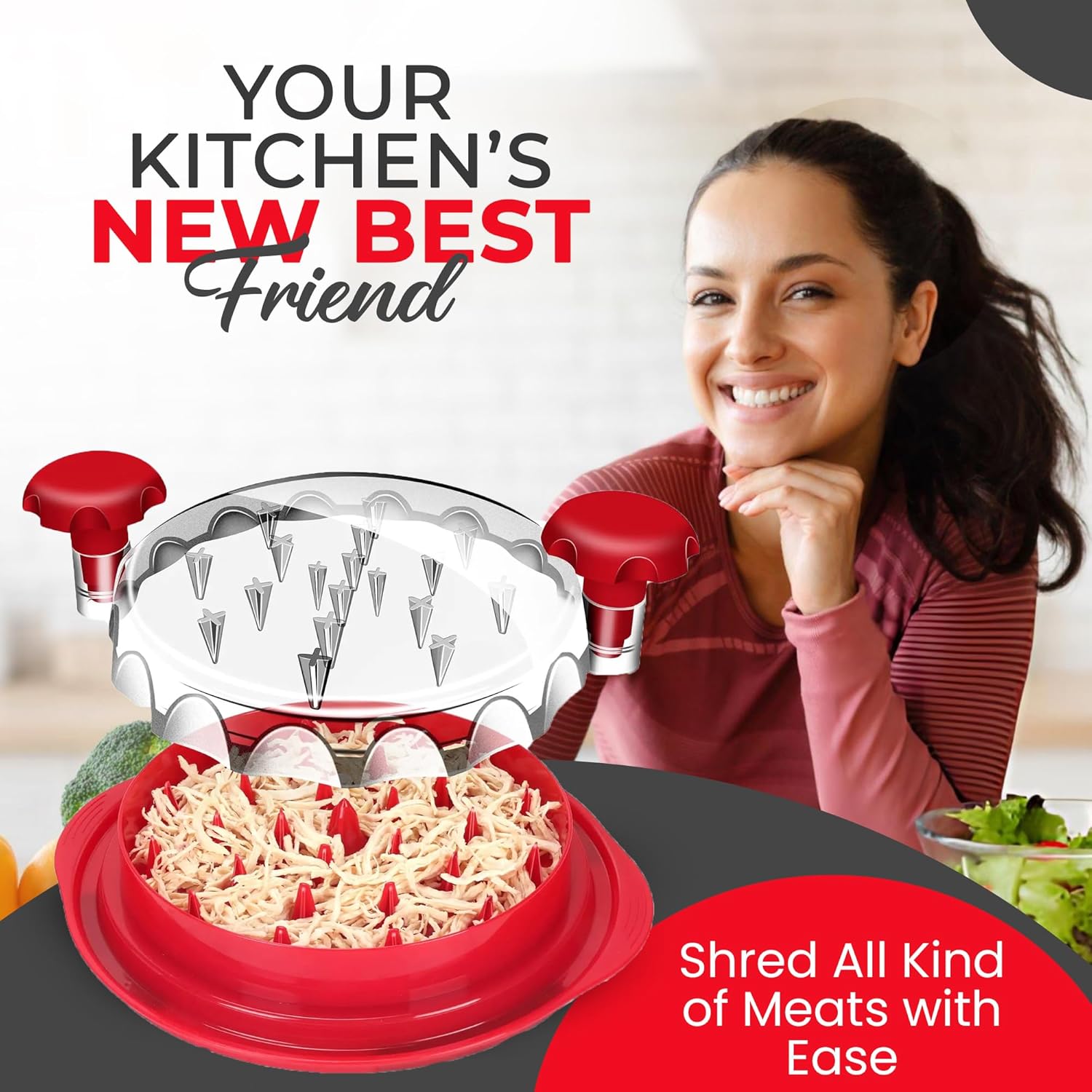 HOW TO USE – This chicken shredder is easy to use. Designed for convenience, simply place cooked meat (chicken, beef, or pork) cut up into small pieces in the meat shredder and cover it with the lid. Depending on how you want the meat shredded, you can twist the shredding tool as desired. Once finished, you can use the tongs to transfer the meat from the shredder into a bowl.