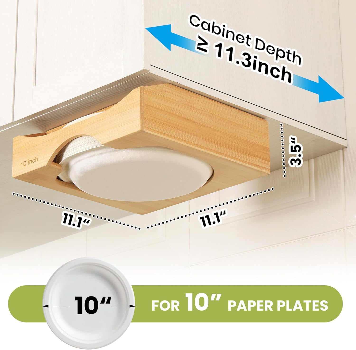 Specifications:Need 11.3 inches deep cabinet space,Make your 10-inch paper plates neat and organized with bamboo paper plate dispenser,Product Dimensions: 11.1″L x 11.1″W x 3.5″H。