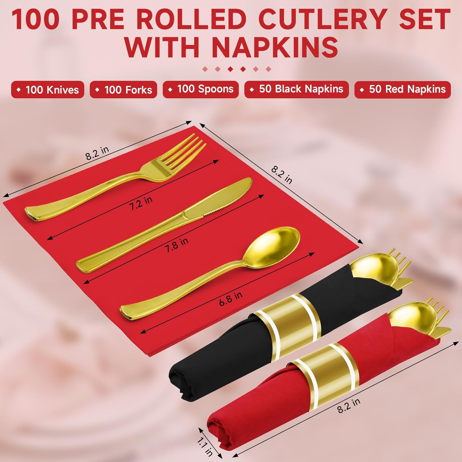 ELEGANT WRAPPED CUTLERY SET: Elevate your event with our all-in-one wrapped cutlery sets, perfect for breakfast, lunch, dinner, or buffet service for up to 100 guests! It includes 50 gold plastic fork, knife, and spoon packs wrapped in black napkins, plus 50 in red. These pre rolled cutlery set add a luxurious touch to your table decor, making setup effortless while impressing guests with style and convenience. Ideal for creating a sophisticated and comfortable dining experience at any special occasion!