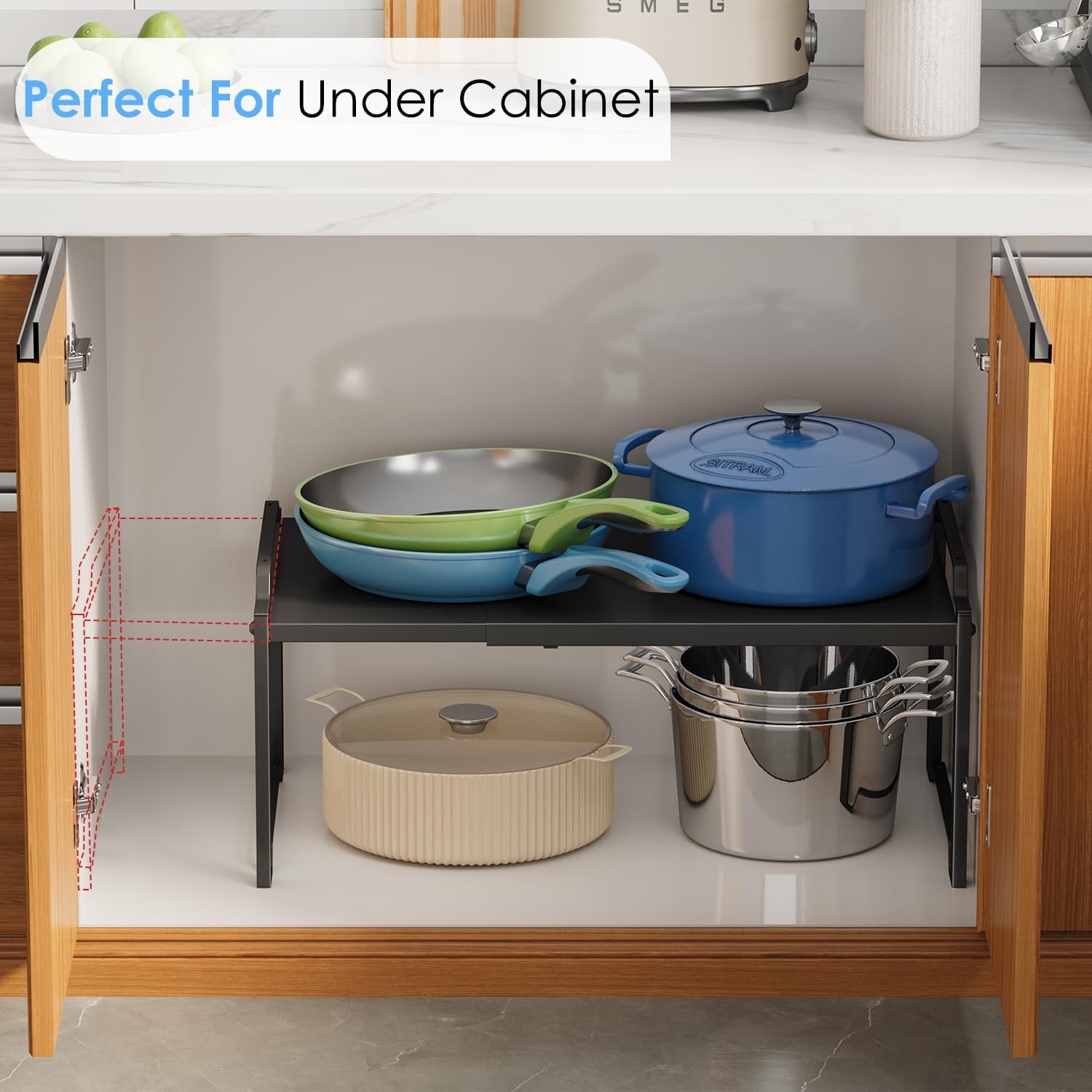 The cabinet storage shelf features a 11 inch widened design.Perfectly for pots pan or other small appliances put in the cabinet/on the kitchen counter/under the island.