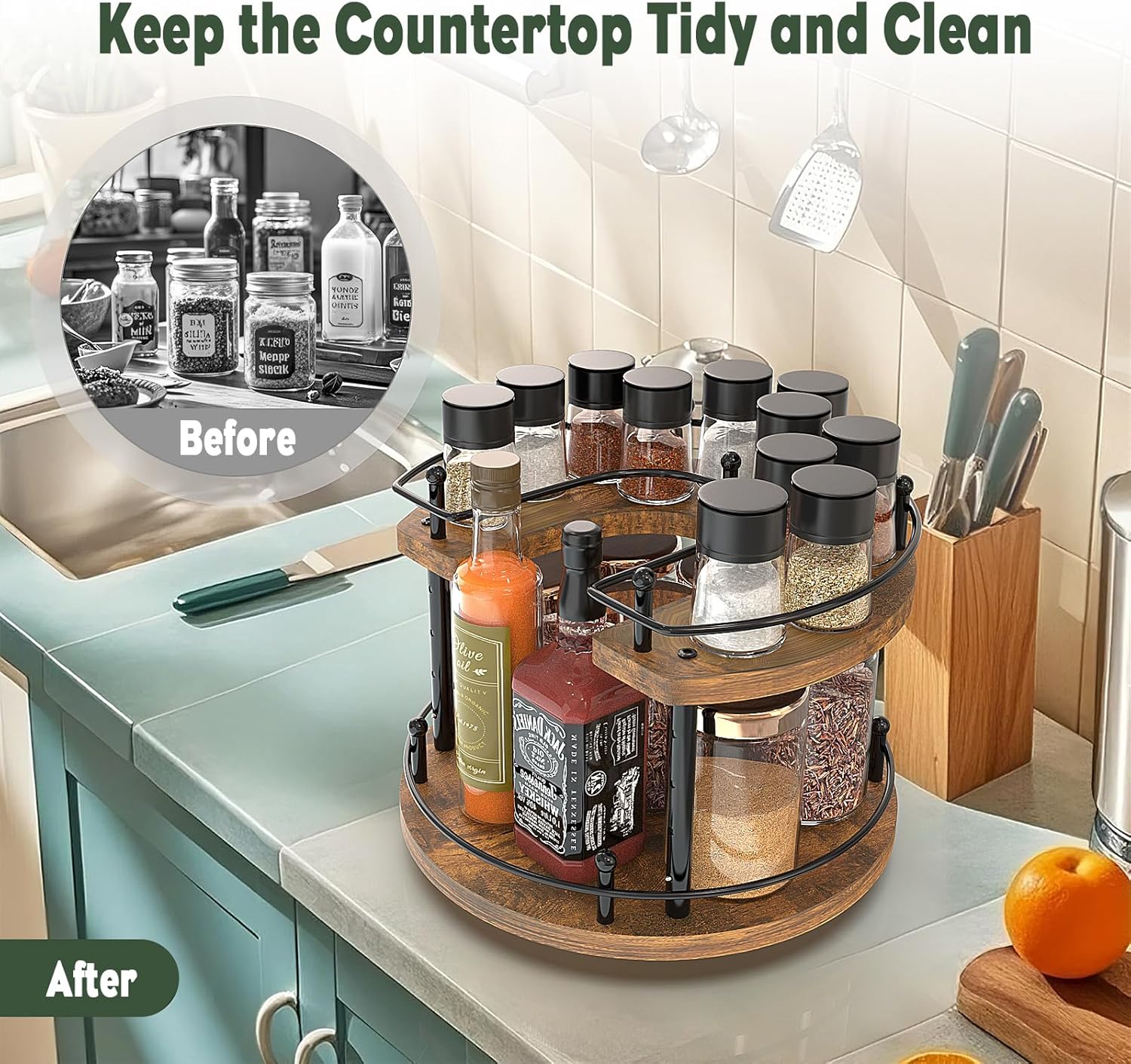 Solid Wood Material:This 2-Tier Lazy Susan Organizer is made of vintage solid wood and metal, combining practicality and design sense. Unlike ordinary wood, it has a special coating that makes it waterproof and heat-resistant,the versatile rustic design blends with any organization style while being easy to clean.