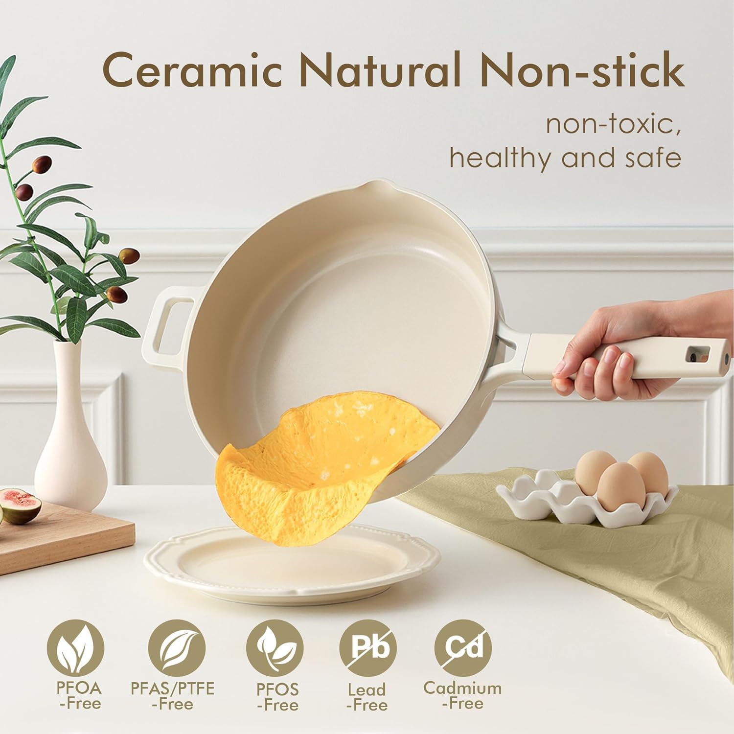 Healthy Ceramic Cookware Set – Non toxic, free of PTFE, PFAS, PFOA, PFOS, lead, cadmium and other toxic substances that can leach into food.