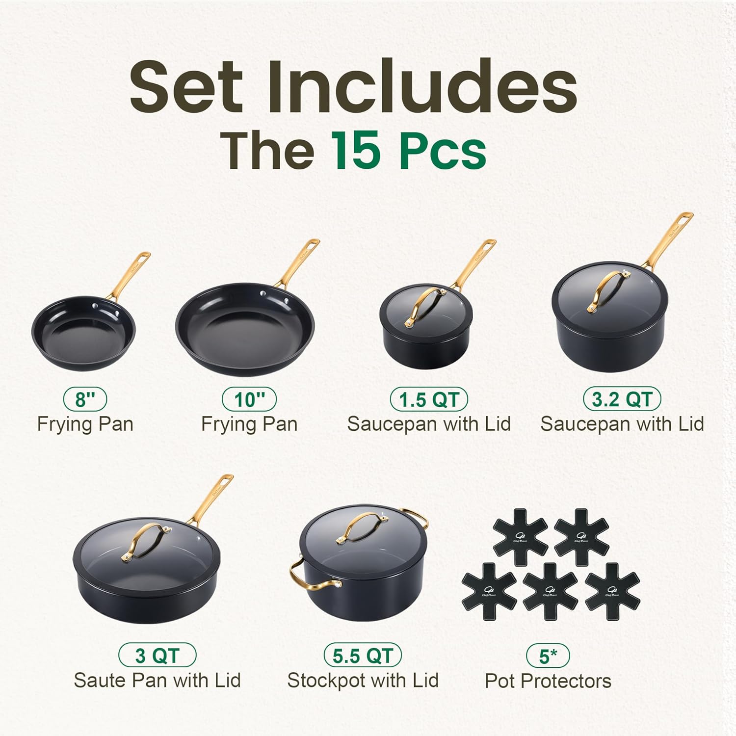 15Pcs Cookware Set Includes: 1.5QT saucepan, 1.5QT saucepan lid, 3.2QT saucepan,3.2QT saucepan lid, 8″ frying pan, 10″ frying pan, 3.0QT sautepan, 3.0QT sautepan lid, 5.5QT casserole, 5.5QT casserole lid, 5 Protectors.
