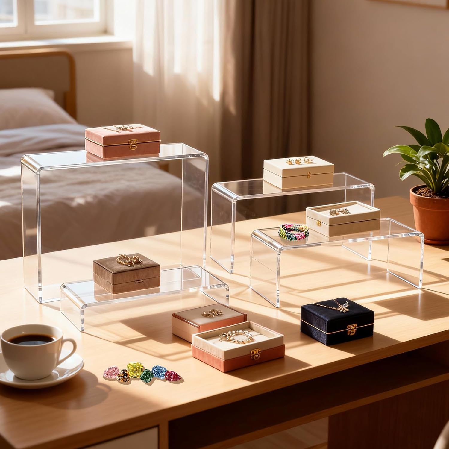 Versatile Usage: You can use acrylic shelves at home, at mall counters, trade shows, coffee shops, bakeries, or during various events and holidays. Display stands are perfect for showcasing a wide range of items, including small statues, collectibles, cosmetics, family photos, jewelry, small goods, and desserts. They work great on counters or platforms, enhancing the visual appeal
