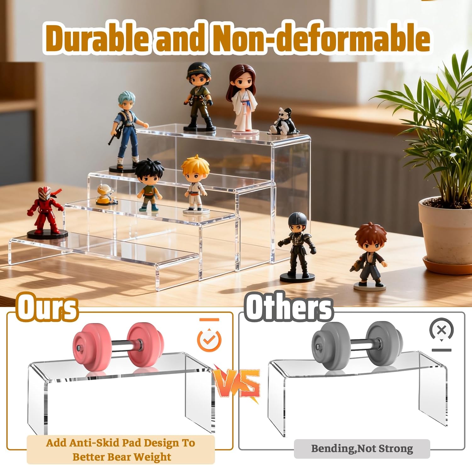 Multiple Sizes to Choose: There are 4 different sizes (7″ to 9″ in length), with 4 pieces of each size. These acrylic risers offer ample space for showcasing a variety of items. Whether displaying small accessories or large collectibles, these stands can accommodate all kinds of display needs.