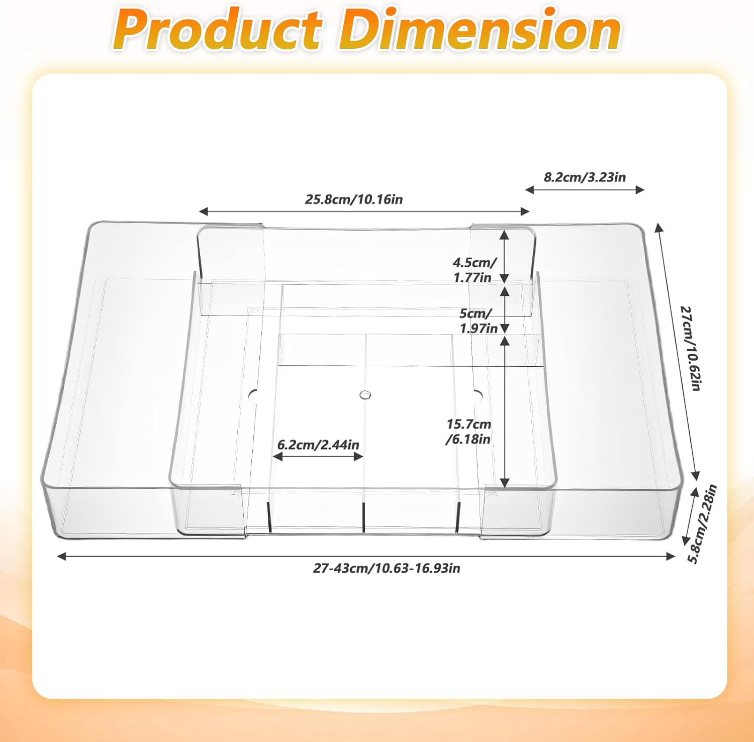 【Expandable Design】This expandable drawer organizer features a width that can be adjusted to fit various drawer sizes. The adjustable organizer tray also includes movable dividers, allowing you to create compartments of different sizes to suit specific items like pens, utensils, or makeup