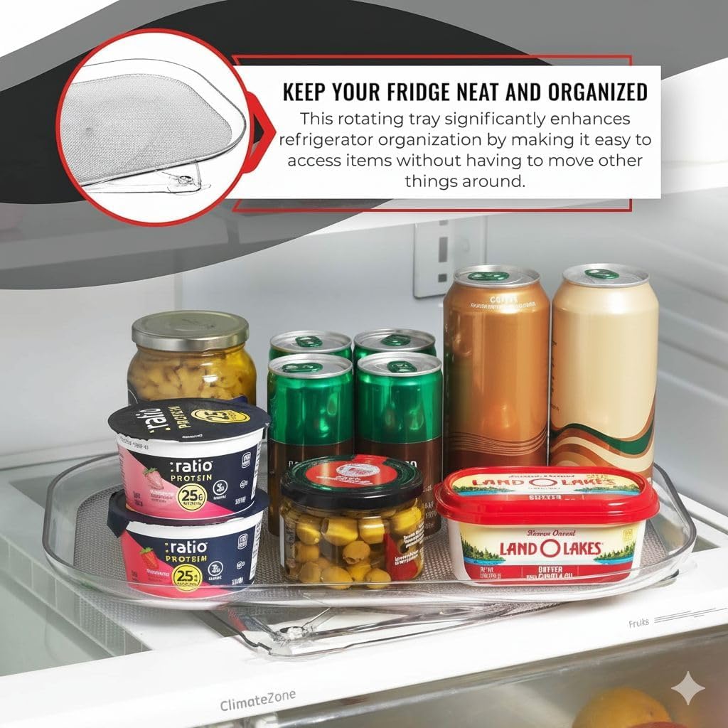 FRIDGE ORGANIZATION: This rotating tray significantly enhances refrigerator organization by making it easy to access items without having to move other things around; it ensures that everything is within reach, reducing clutter and improving efficiency