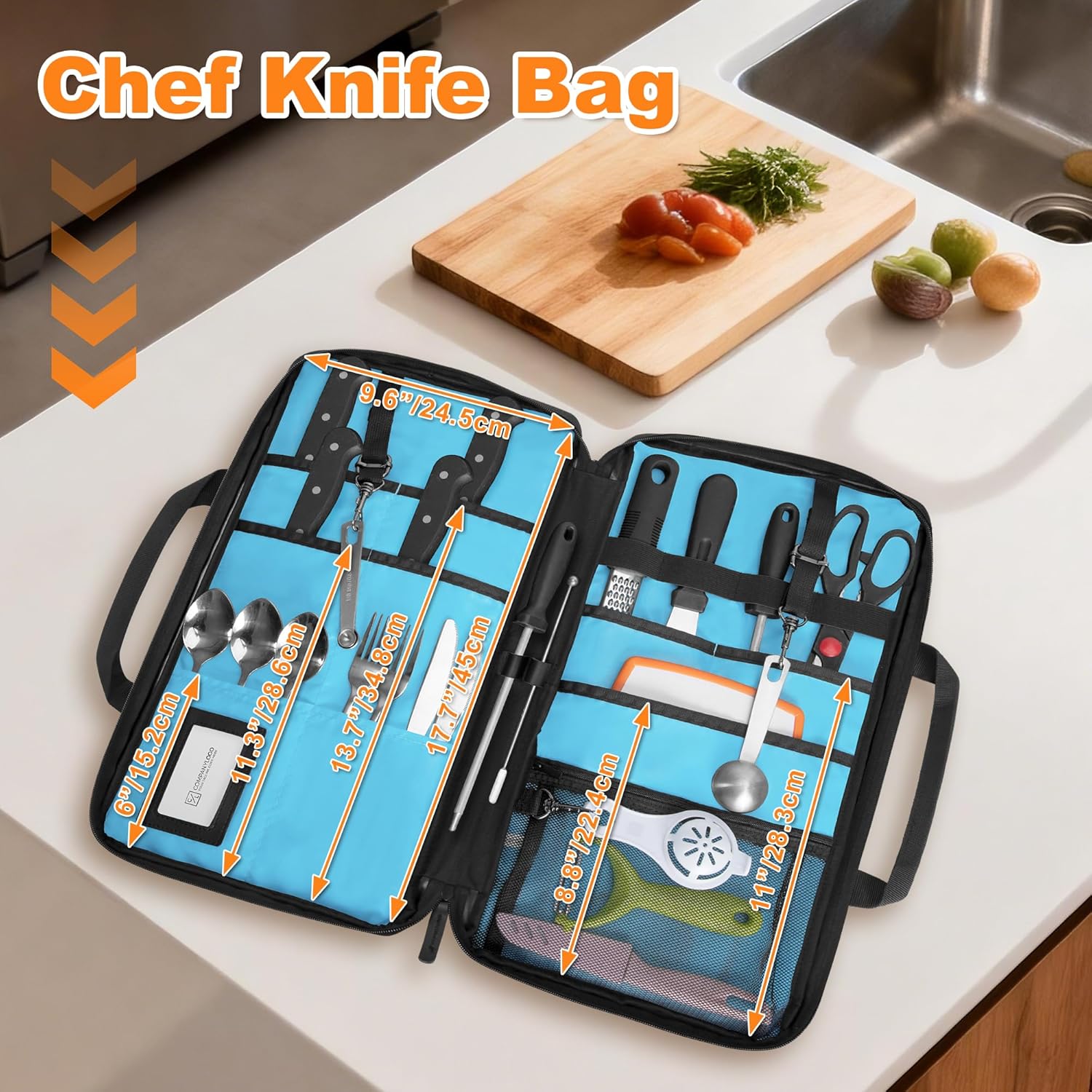 PREMIUM QUALITY The exterior of chef bag is made of 600D ballistic nylon and synthetic leather, avoiding scratches and waterThe interior is used with padding and firm stitches, keeping your knives saferWith leather dual-way zippers, the storage bag is built to last