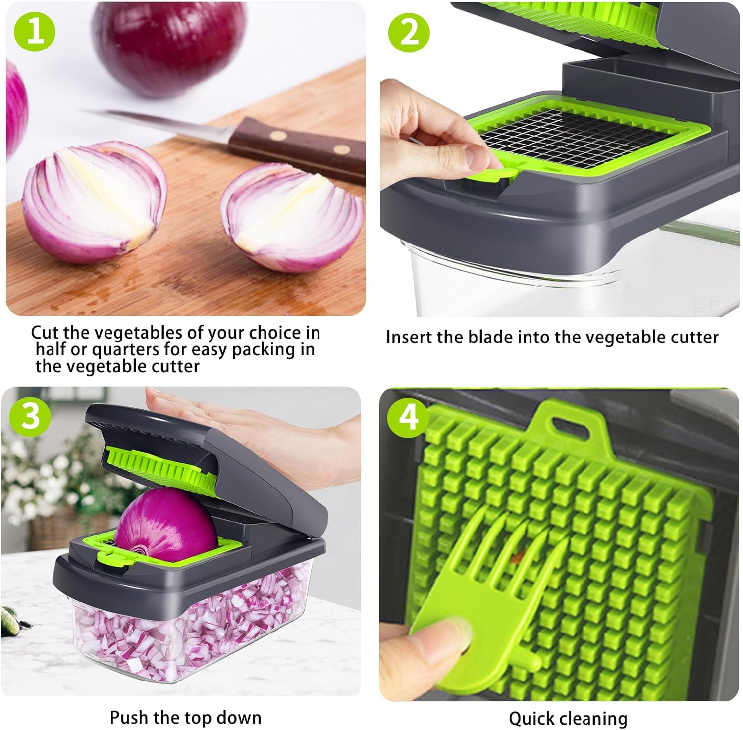 【Effortless Cleanup】ehyphen Chopper with Non-Stick Coating Simplify cleanup with ergonomic handles and detachable parts that rinse in seconds under running water. The non-stick coating on blades and container prevents food residue buildup, while the built-in storage case keeps blades organized and counters clutter-free. Perfect for messy ingredients like onions or cucumbers—no dishwasher required!