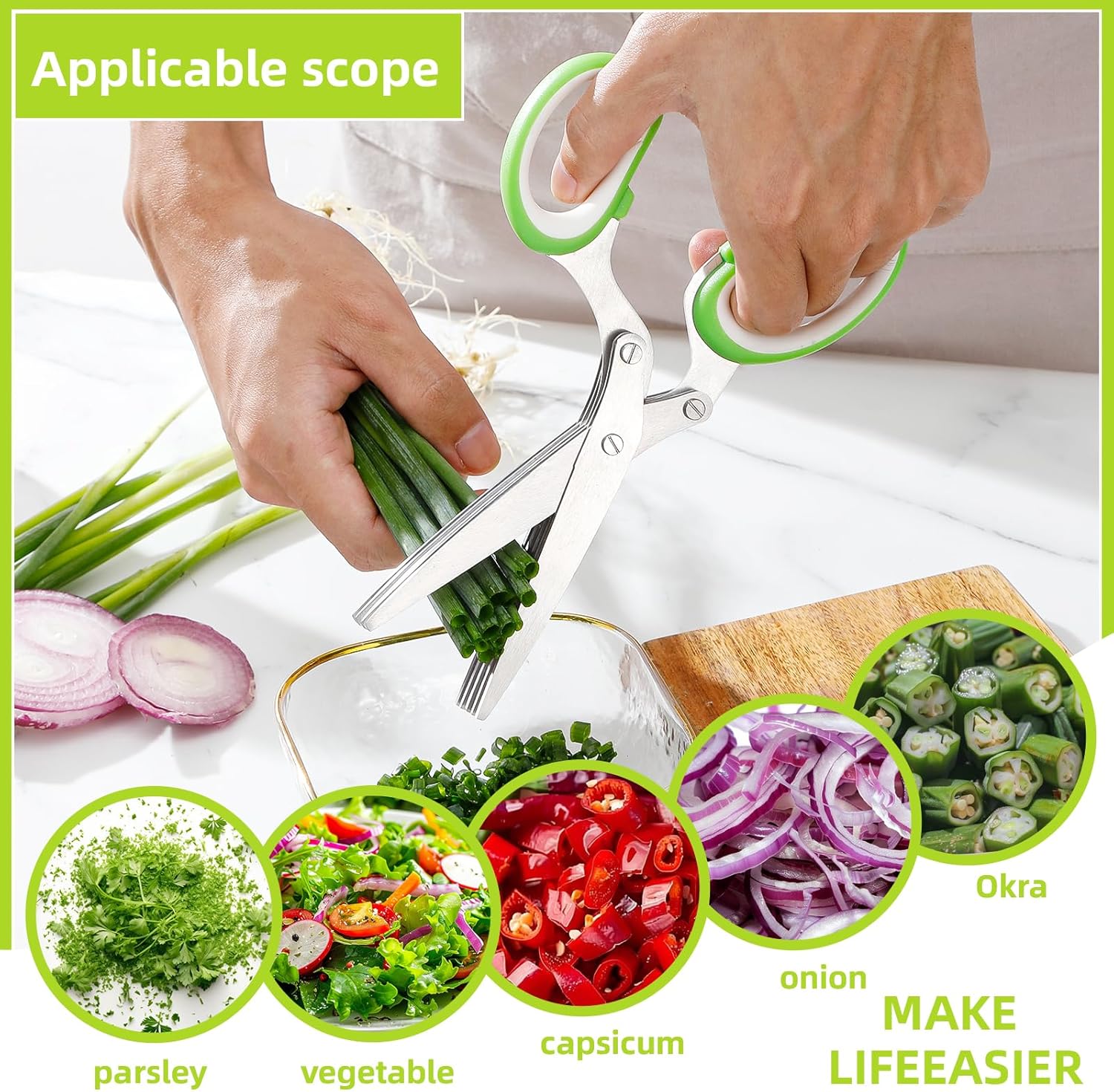 ccraowo versatile herb scissors, designed to make life easier in the kitchen. Equipped with 5 blades, these scissors effortlessly cut a variety of fresh ingredients, including parsley, vegetables, capsicum, onions, and okra. The skin-friendly handle ensures a delicate and comfortable grip, making food preparation quick and efficient. Ideal for anyone looking to streamline their cooking process and enjoy fresh, finely chopped herbs and vegetables with ease.