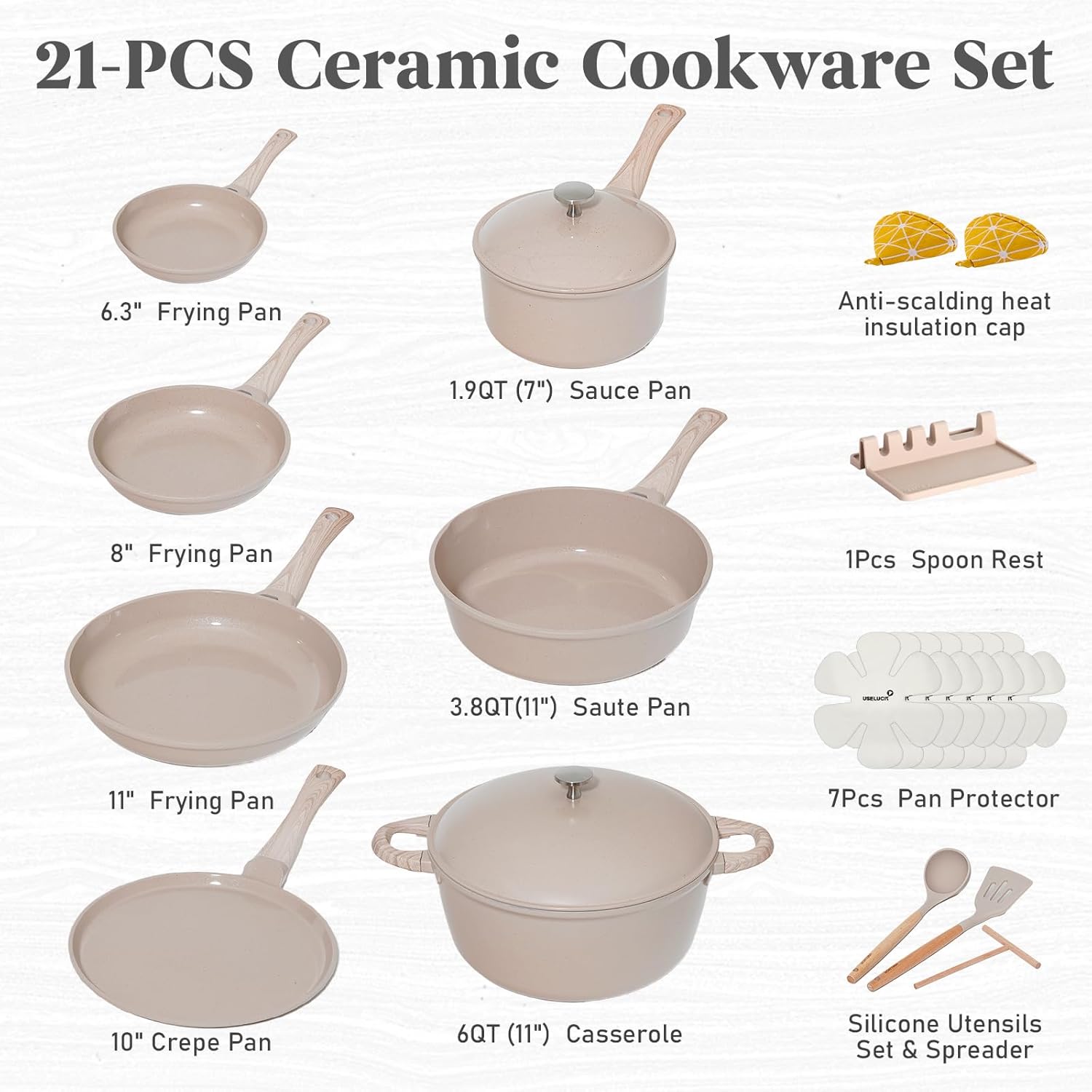 【Complete Set with Accessories – Backed by Useluck Warranty】This 21-piece non stick cookware set includes: 6.3″ / 8″ / 11″ frying pans, 10″ crepe pan, 1.9QT sauce pan, 3.8QT sauté pan, 6QT casserole, 2 lids, spoon rest, 7 pan protectors, 2 anti-heat caps, silicone utensil set, and a space-saving rack. Covered by Useluck’s hassle-free warranty and friendly customer service