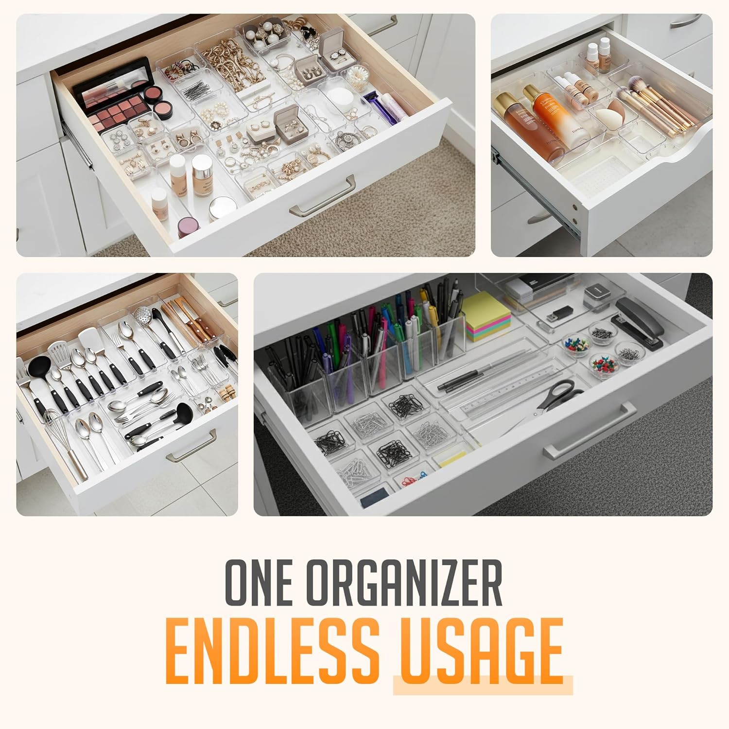 VERSATILE DRAWER ORGANIZER FOR EVERY ROOM: Tidy up kitchen drawers, bathroom vanities, office desks, and bedroom nightstands. This 25-piece clear organizer set adapts to any space, making it a must-have for streamlined storage