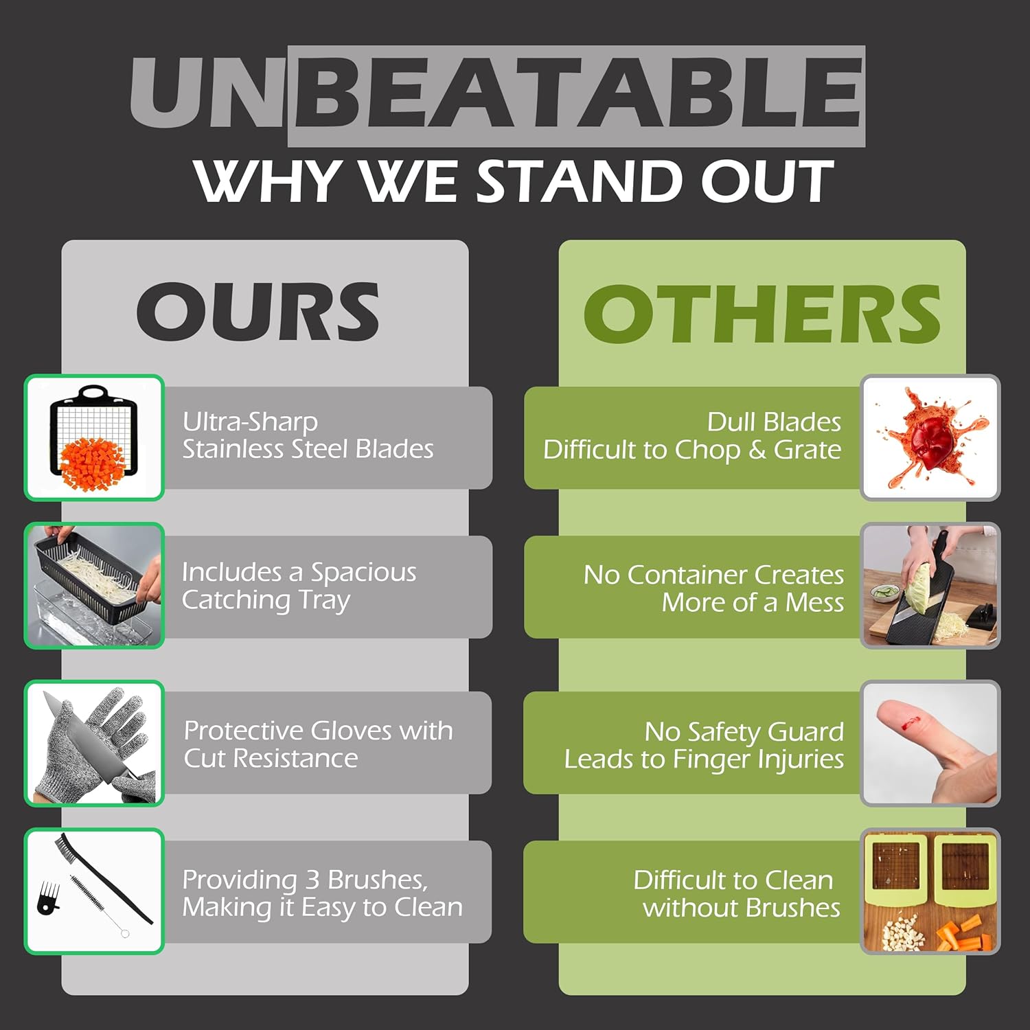 Your Fingers Will Thank Us: Keep your fingers happy and intact – our onion chopper dicer comes with cut-resistant gloves a sturdy hand guard to keep your fingers safe and sound while you slice and dice. Because the only thing we want you chopping are vegetables, not fingertips