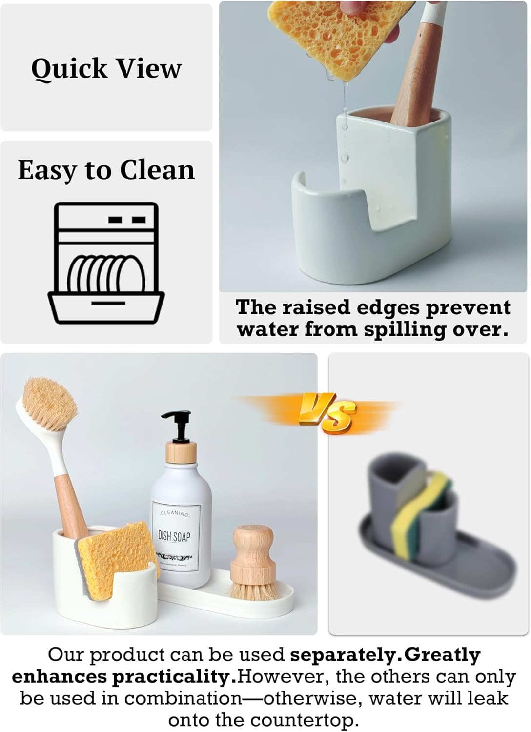 Yes. The sponge holder + leak-proof tray can hold several items—sponges, dish brush, scrubbers, even a soap bottle. You can use them together or separately, and the raised-edge tray keeps water off your countertop.