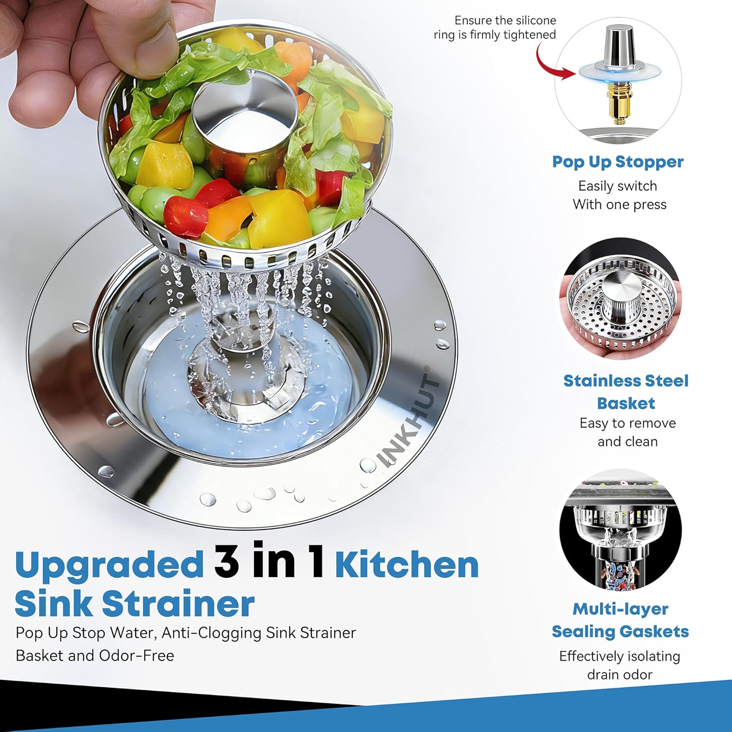 Effortless 3-in-1 Functionality: Introducing our revolutionary 3 in 1 kitchen sink drain strainer, engineered to streamline your kitchen tasks with unparalleled efficiency and durability. Seamlessly combining water storage, sink filter, and odor isolation functions, it streamlines your daily routine for unparalleled convenience. Say goodbye to clogged drains as it efficiently food catcher, ensuring smooth, uninterrupted drainage