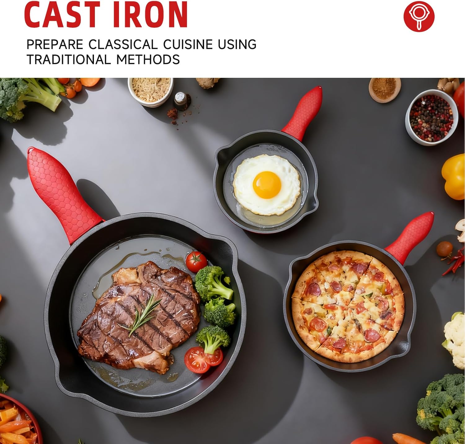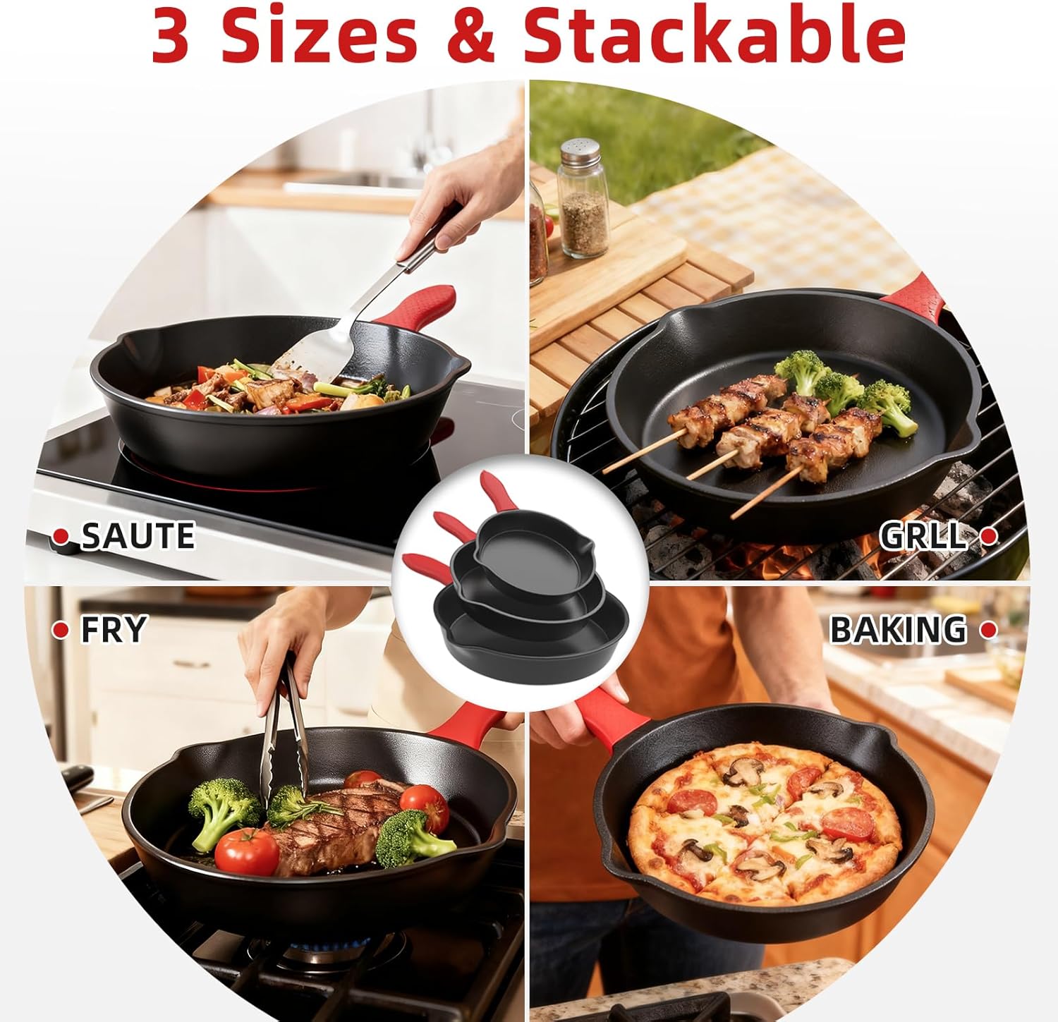 3-Piece Cast Iron Skillet Set, 6-8-10 Inches, Versatile Cookware with Heat-Resistant Covers