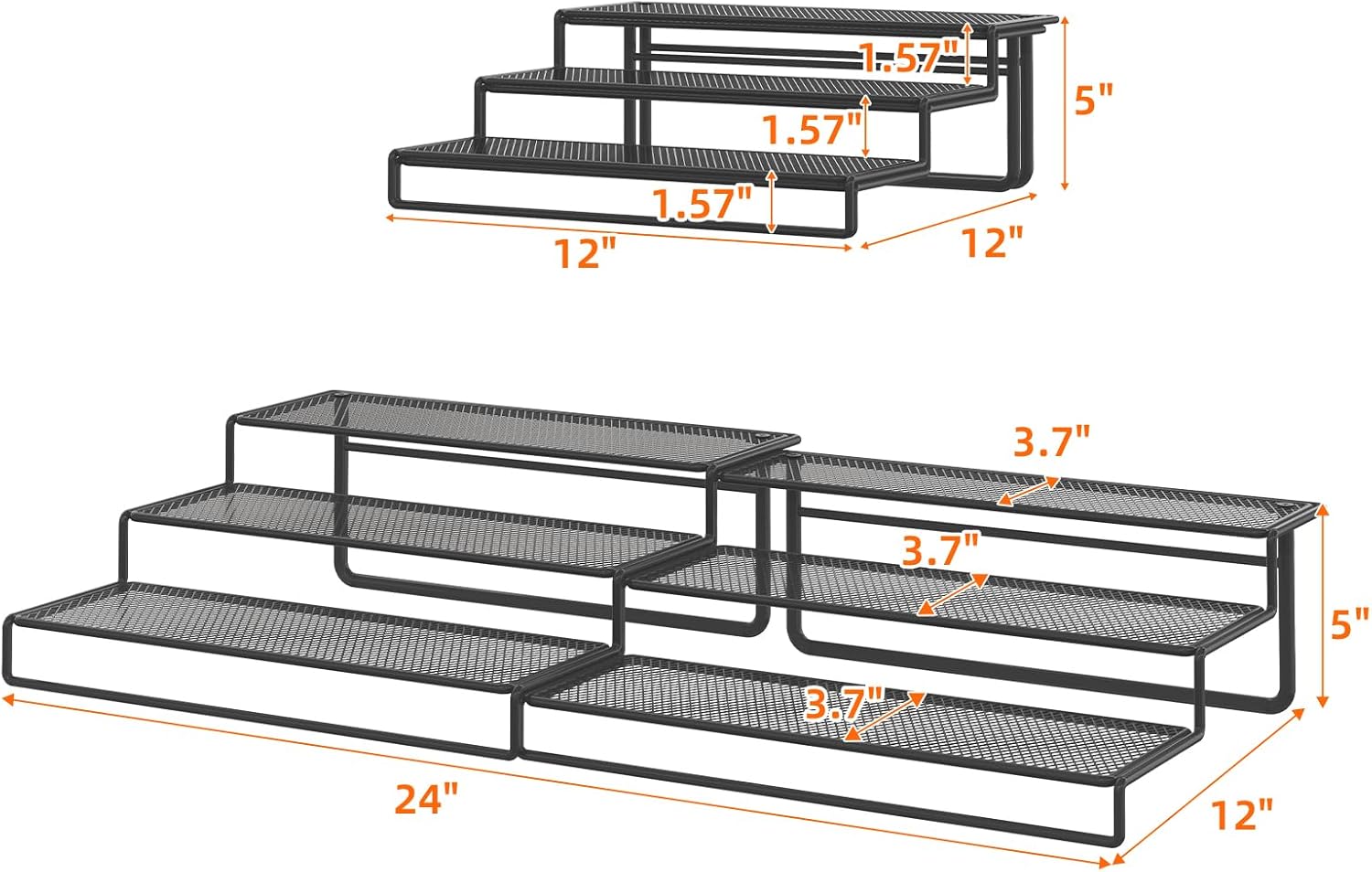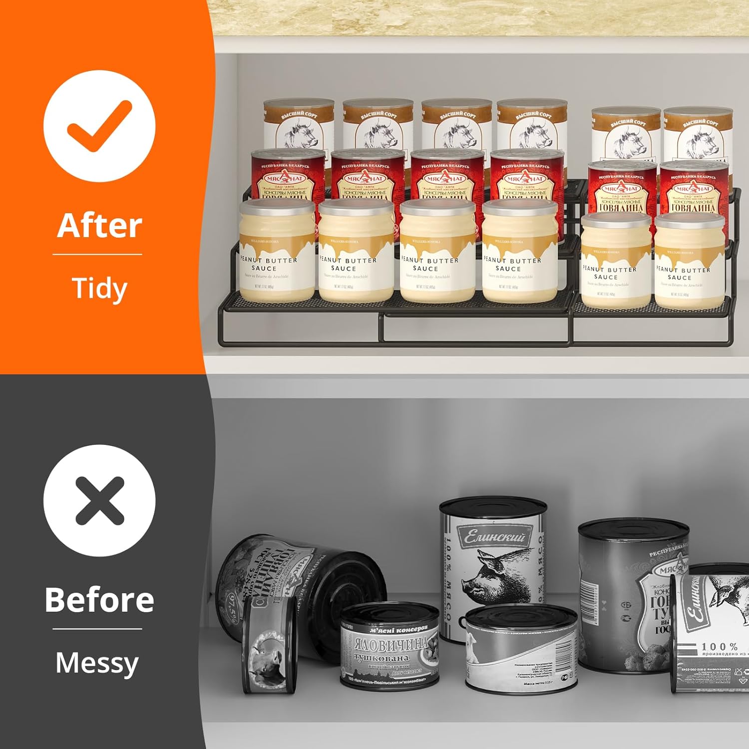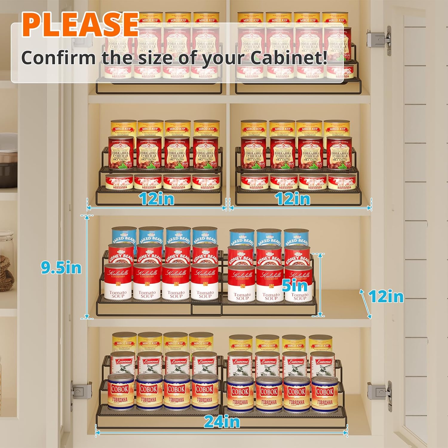 Expandable Design: The expandable shelf features a 3-tier telescoping structure, allowing this versatile can organizer to adjust from 12 inches to a full 24 inches, fitting your pantry needs.