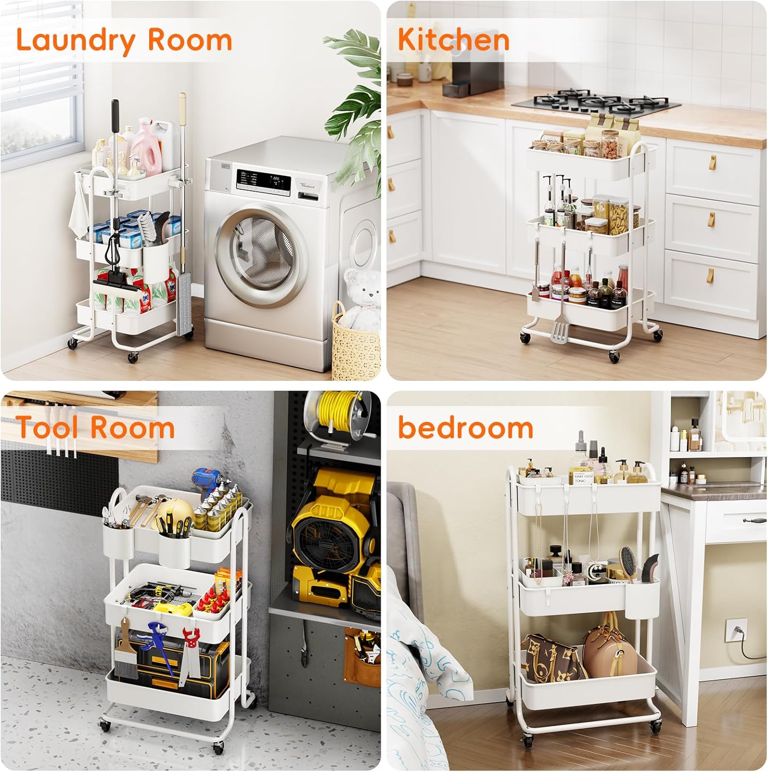 【A Truly Versatile Cart】This three tier rolling cart serves not only as storage in laundry, bedroom, kitchen and nurseries, but also as a whole-house cleaning assistant. The rolling cart organizer eliminates the need to constantly move between rooms, performing as your reliable, on-call cleaning command center.
