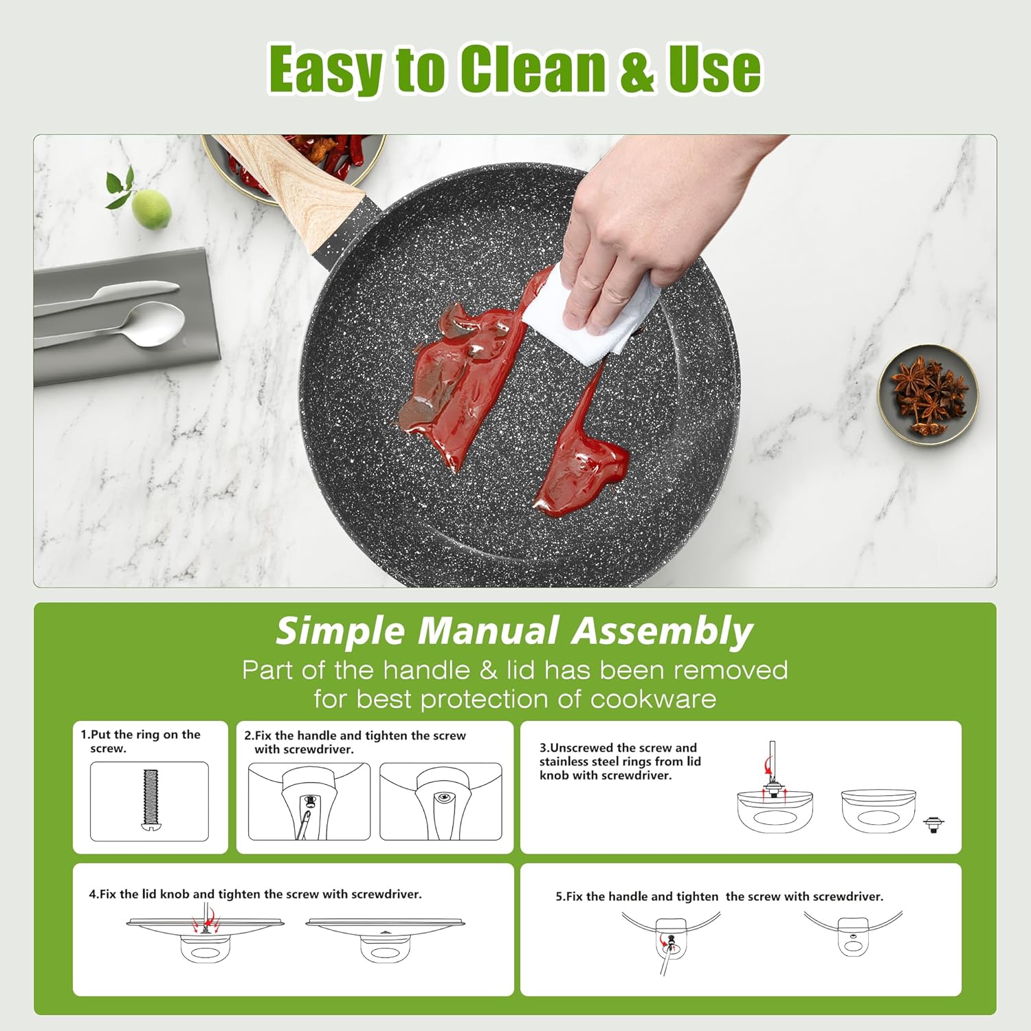 Easy to Clean & Use: Recommend to hand wash the cookware after each meal as it cleans effortlessly. Simply wipe with a paper towel or rinse with water. In addition, some of the handles and lids have been removed to better protect the cookware, so you need to simple manual assembly, please refer to the instructions for details.
