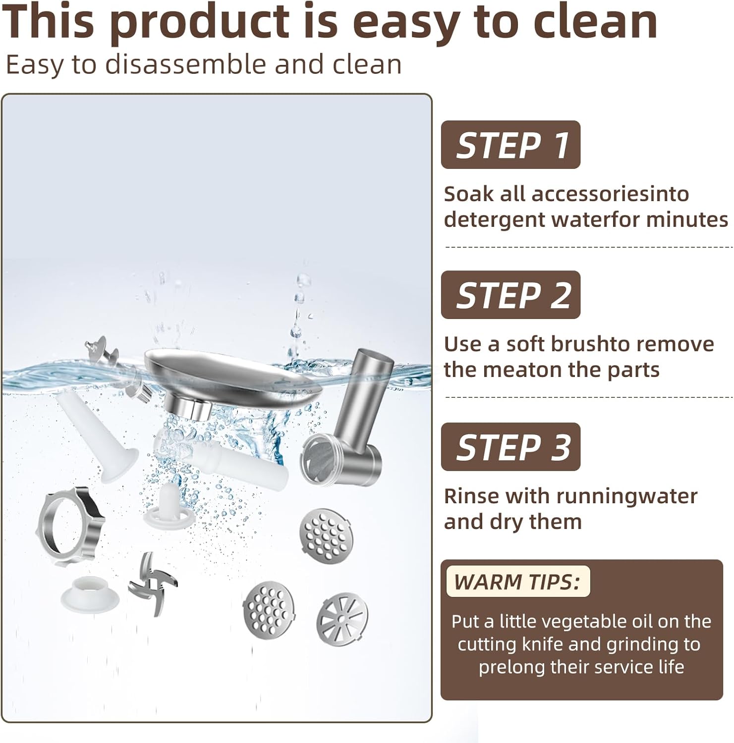 DURABLE AND EASY TO CLEAN:Made with high-quality stainless steel and durable construction, this meat grinder is built to last. The detachable parts are easy to assemble and disassemble, making cleanup a breeze. Please note that this product is not dishwasher safe.