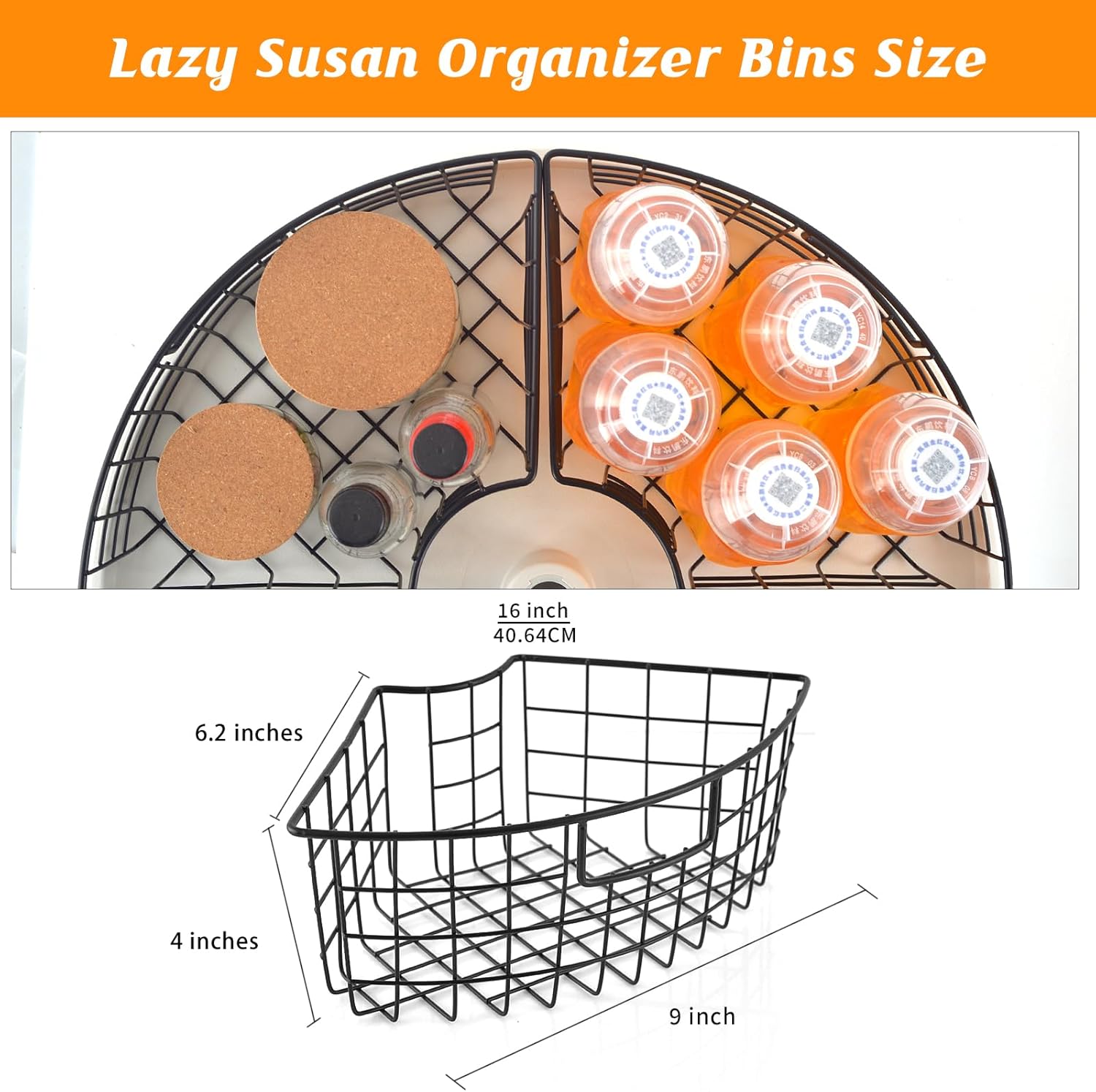 1.Suitable Size: The size of lazy susan basket is 9x 6.2 x4 inches, 4 identical 1/4 wedge bins form a complete circle, suitable for Lazy Susan corner cabinets with diameters of 18 inches – 20 inches.Please make sure the size is suitable before purchasing.Note: Please pay attention to product size when purchasing.