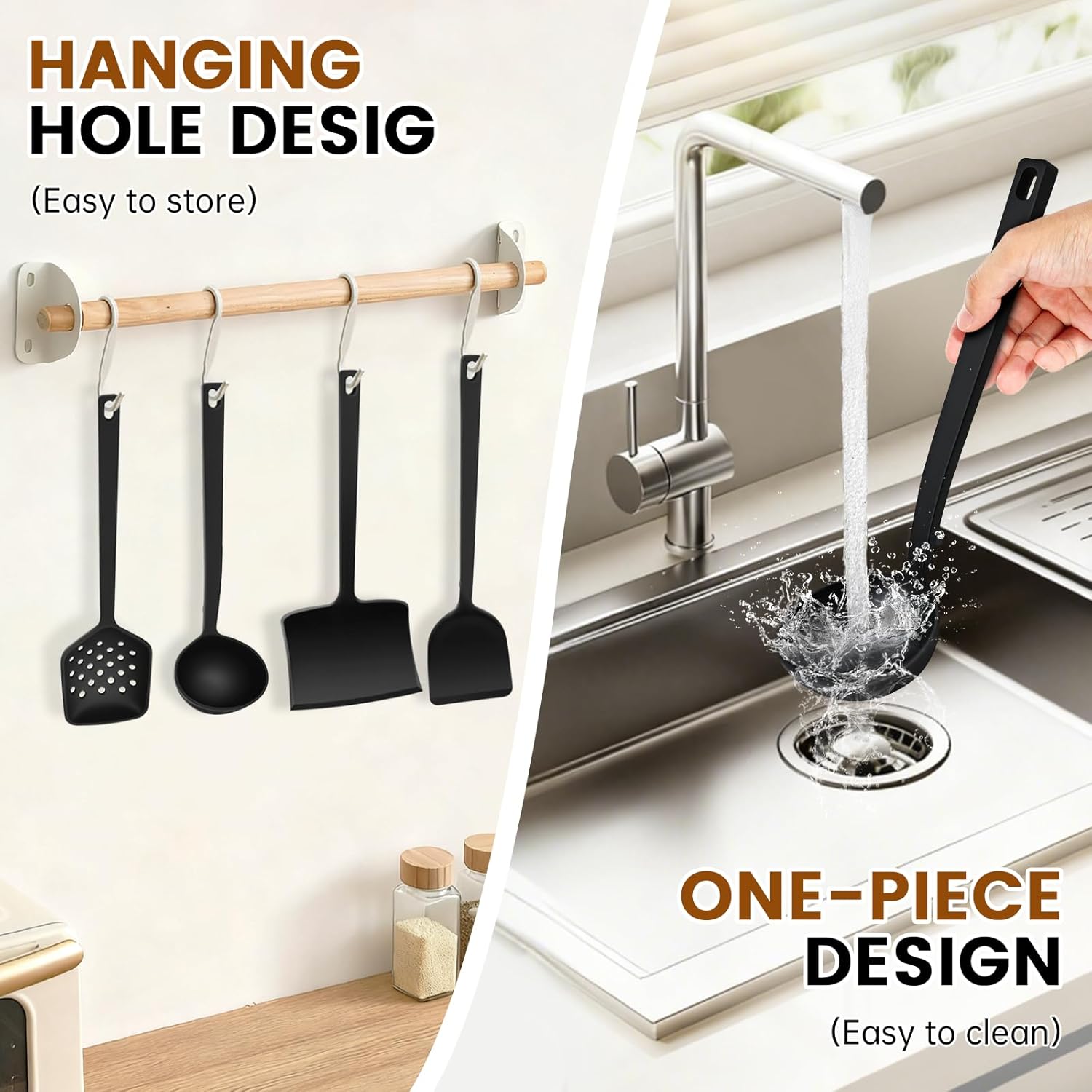 【NON-STICK & EASY TO CLEAN】Say goodbye to stuck-on food and tedious scrubbing. Crafted from non-porous silicone, our cooking utensils resist stains and odors while wiping clean effortlessly. The seamless design leaves no room for food particles to hide in cracks or joints. Plus, they’re dishwasher safe — whether you clean by hand or simply toss them in the dishwasher. Spend less time cleaning and more time enjoying your meals.
