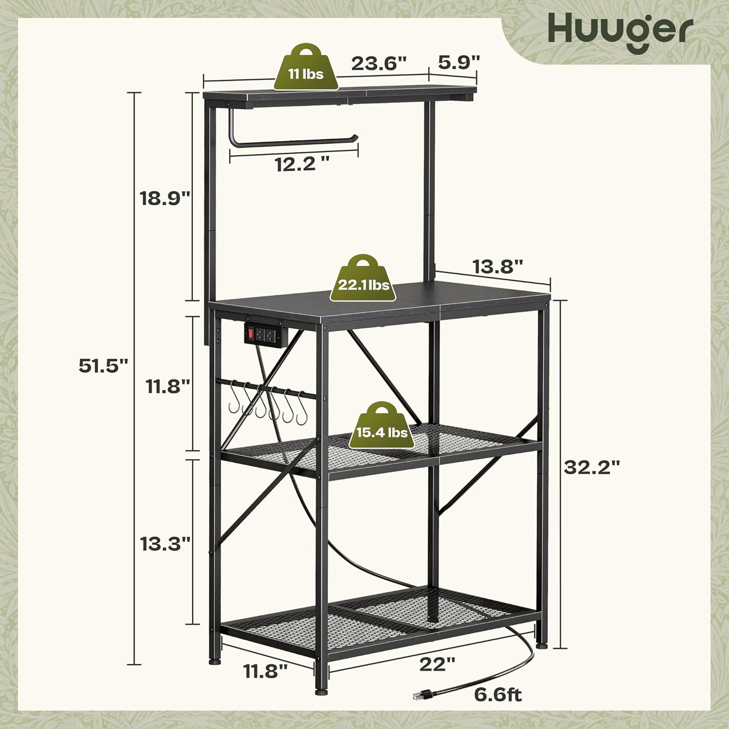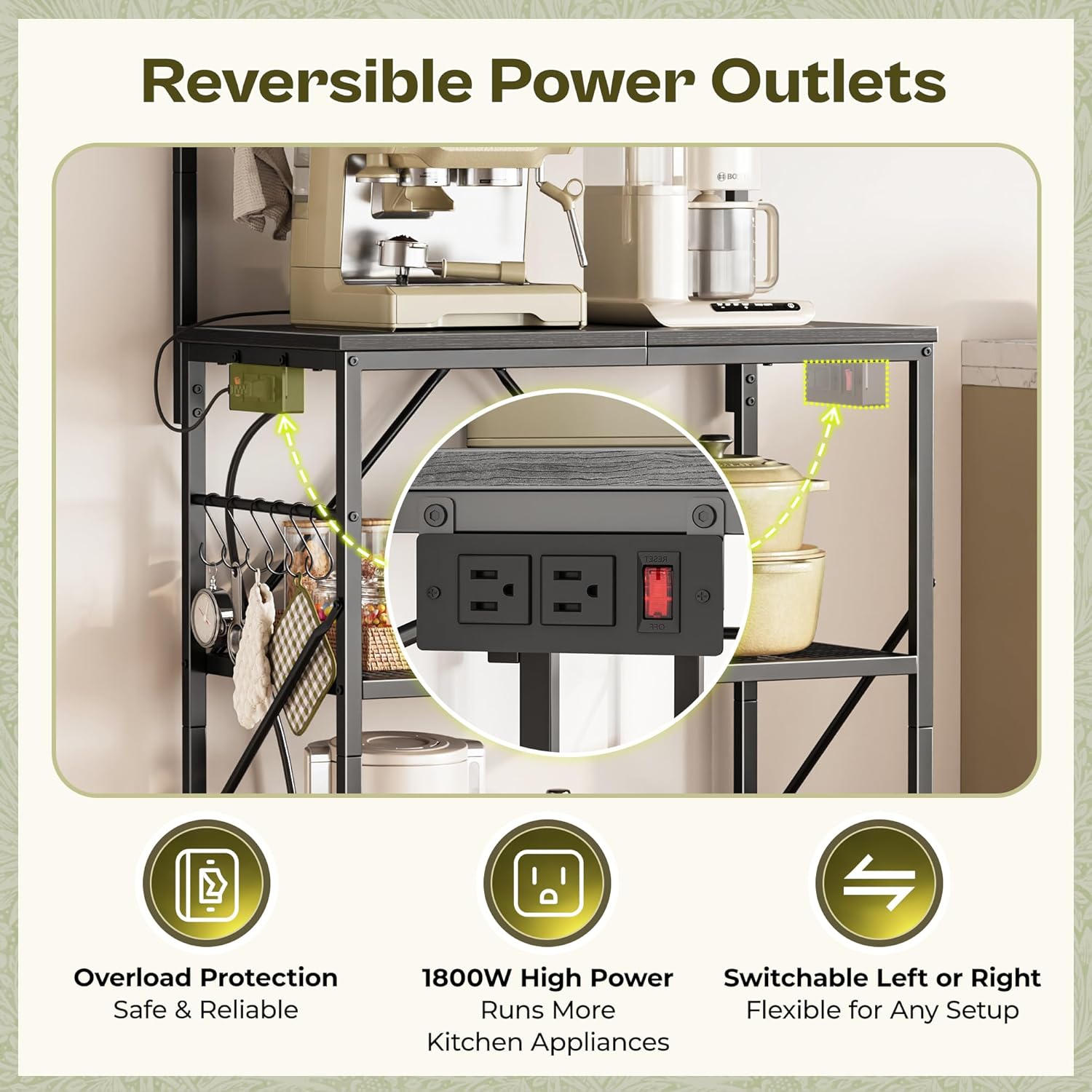 【Built-in Power Strip】No more running cords across the kitchen! The 2 AC outlets of the kitchen shelf rack let you safely power multiple appliances like your coffee machine and blender at once. With 1800W overload protection, you can cook, bake, and blend without worrying about safety