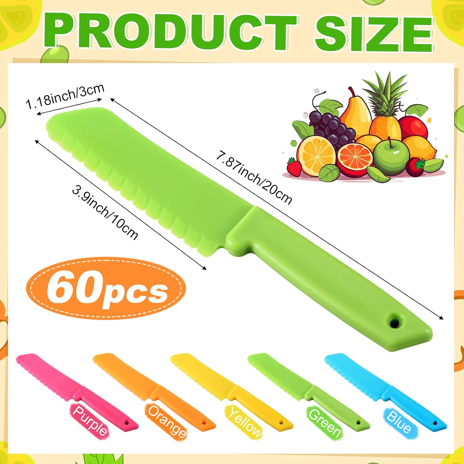 Enough Quantity: Package includes 60 pieces kids plastic safe knives; 5 Colors: blue, yellow, green, orange and rose red, 12 pieces for each color; The colorful kid’s knives set can help you create delicious dishes