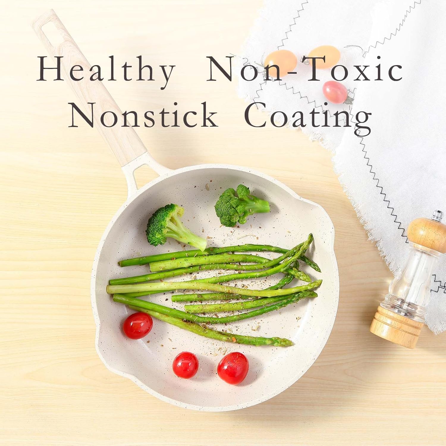 Eco-friendly Non-Stick Ceramic Coating & Super Easy to Clean – Our cookware set interior is coated by non-stick ceramic coating, SGS approved, 100% PFOA free. Require less oil or butter for cooking and minimal scrubbing for a spotless clean, giving you a healthier and more enjoyable at-home cooking experience.