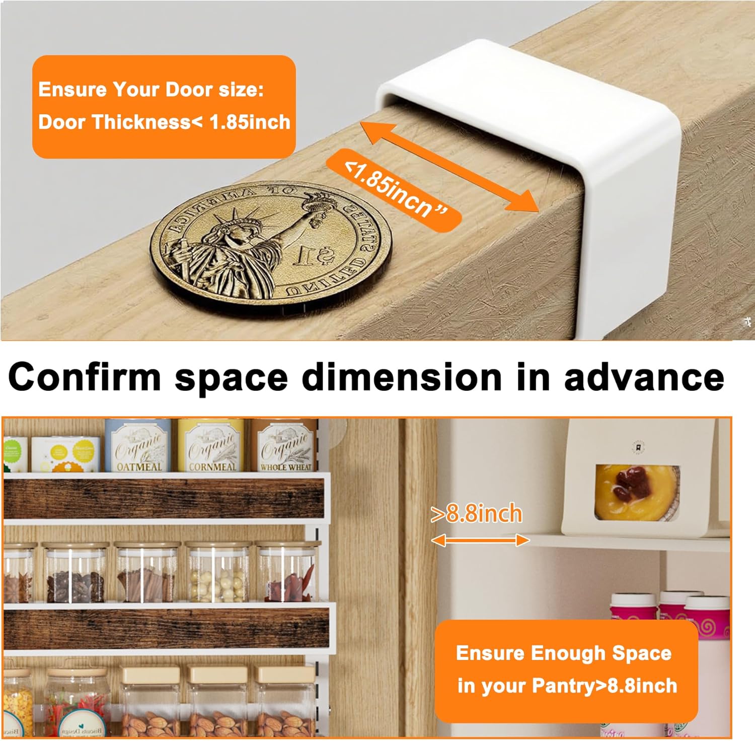โšกใ€๐€๐๐ฃ๐ฎ๐ฌ๐ญ๐š๐›๐ฅ๐ž ๐๐š๐ฌ๐ค๐ž๐ญ ใ€‘ The pantry door organizer features adjustable basket,allows you to customize storage space according to your specific needs and is convenient to take out. They can easily hold a different size items, including seasoning containers,spice jars,snacks,water bottle,food,coffee syrup,with Durable heavy duty bakset make it easy to use for long time and without bending or breaking