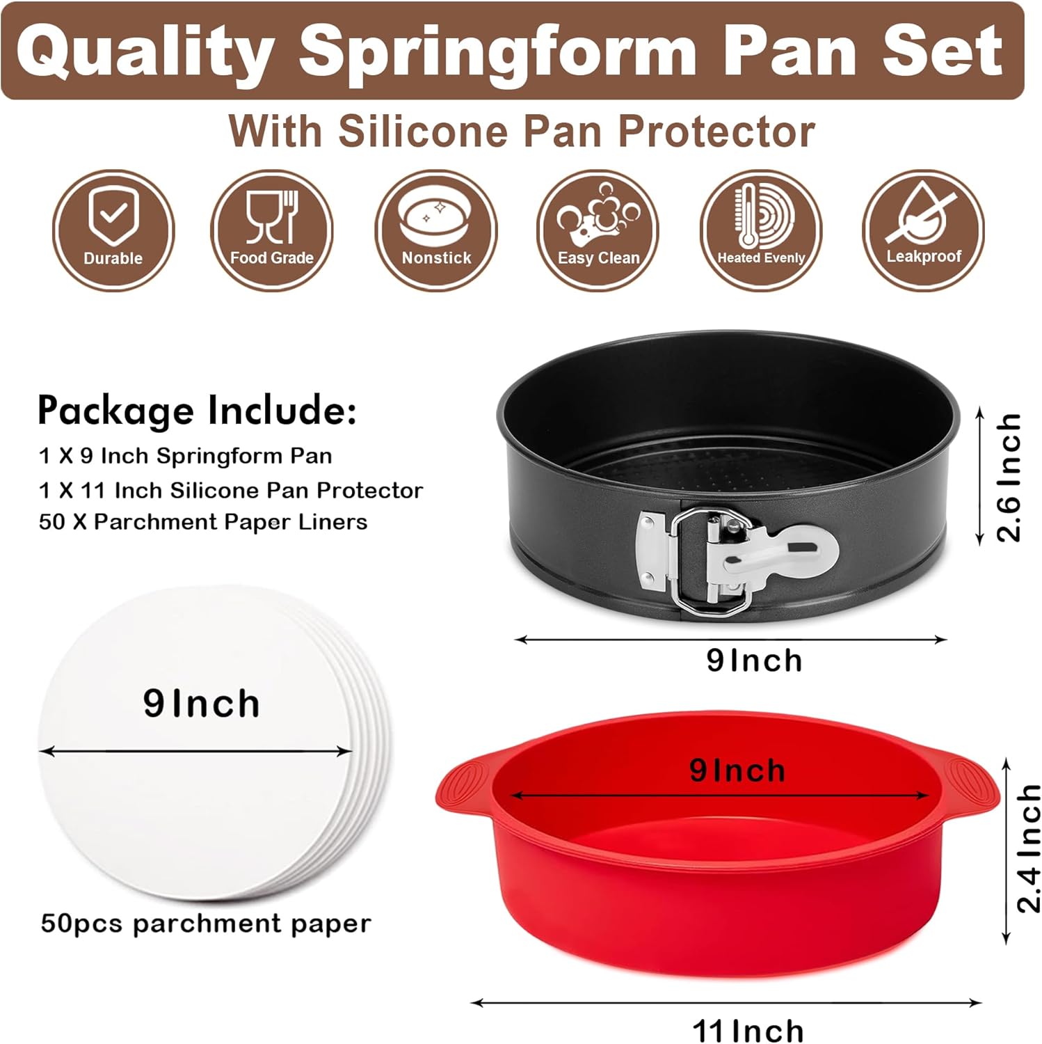 High Quality Springform Pan 9 Inch Nonstick – Leakproof springform pan set comes with 1pcs springform pan 9 inch nonstick, 1pcs cheesecake pan protector and 50pcs parchment paper. Spring form pan for cheesecake is ideal for making cheese cake, yogurt cake, mousse, coffee cake, lasagna, quiche, paella, cookies and any similar recipe, and the spring pans for baking cheesecake also makes a great and practical gift for your friends.