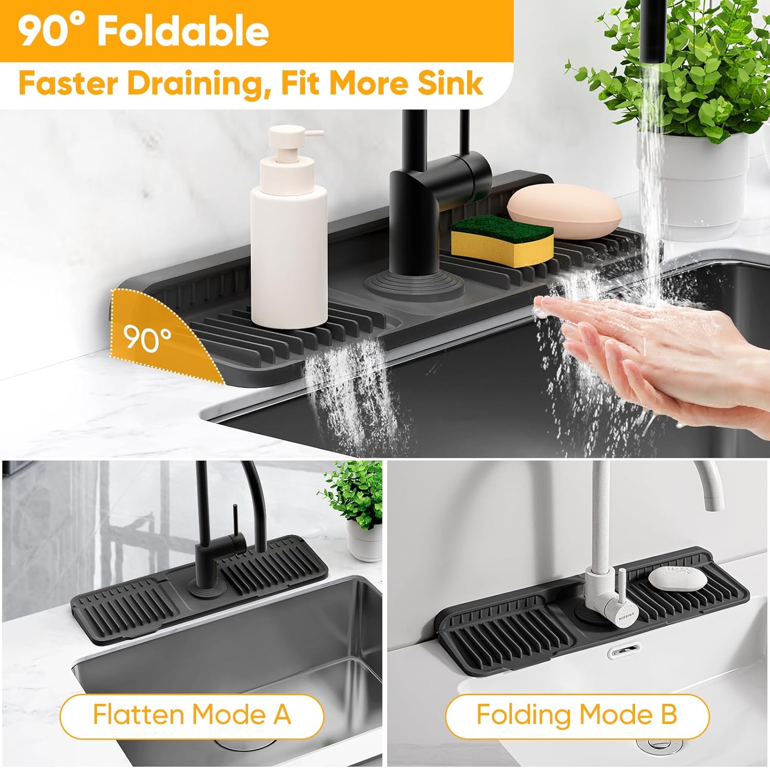 😎【90° Foldable Better Draining, Fit More Sinks】 The back is flexible meaning if you don’t have much space back there, You can fold the sink faucet mat splash guard by 0-1.2 inch to use and if you have more space, It can be stably laid flat on your countertops. The 90° foldable design allows easy attachment to the wall, fitting various sink countertops. This durable silicone sink splash guard keeps your sink dry and tidy while efficiently draining water for ultimate kitchen convenience.