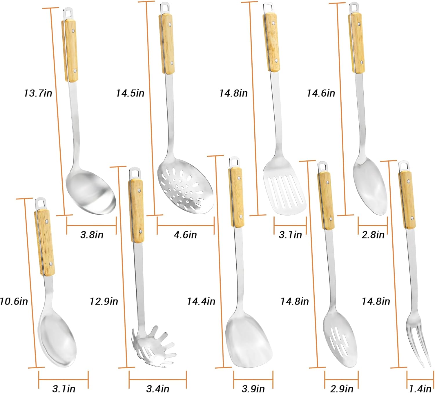 【Design of the Kitchenware Set】 : Wooden handle is ergonomic, durable and heat-resistant. Can be easily turned and cooked to help you make delicious dishes