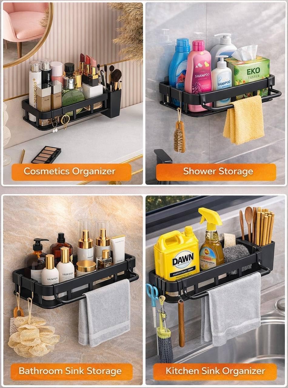 This 2-pack wall-mounted organizer set includes all essential accessories to keep your bathroom, shower, or kitchen neat and organized. No drilling required — everything mounts securely using strong adhesive pads.