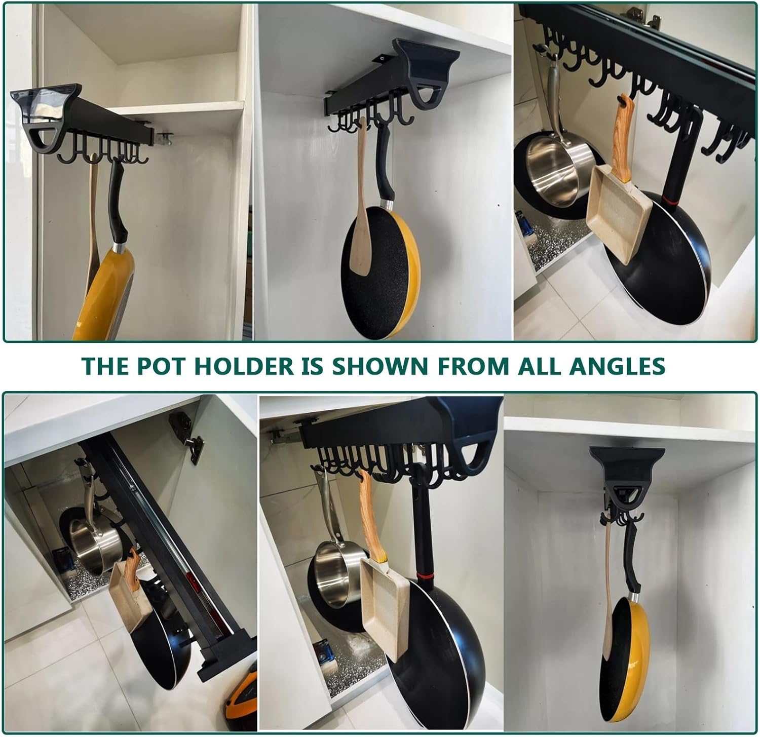Adjustable Pot Rack For Cabinet – The New Design pot organizers with 10 hooks is made of stainless steel and Aluminum alloy, high-texture paint frame,Newly upgraded metal base for greater durability. Adjustable Pot Racks is 22inch (56cm) long and is suitable for Cabinet with a depth of more than 23inch (58cm).