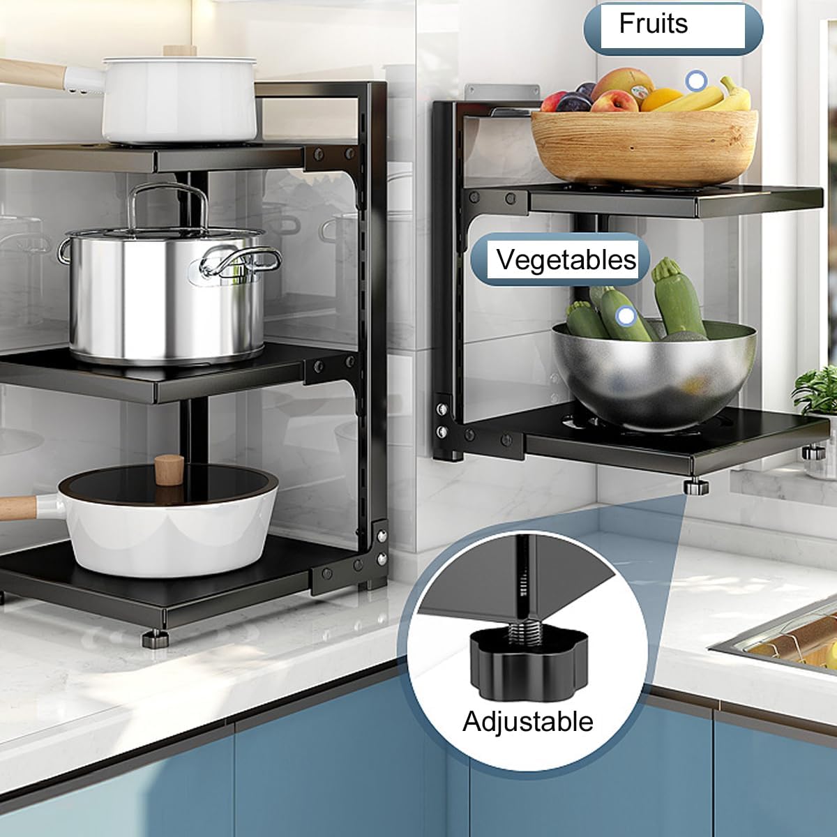 Adjustable Tiers – Customize each tier position according to your pan and pot heights. You can quickly get out a heavy iron skillet from the shelf. Fit all sizes of pans. Also a good pot lid organizer for cabinet.