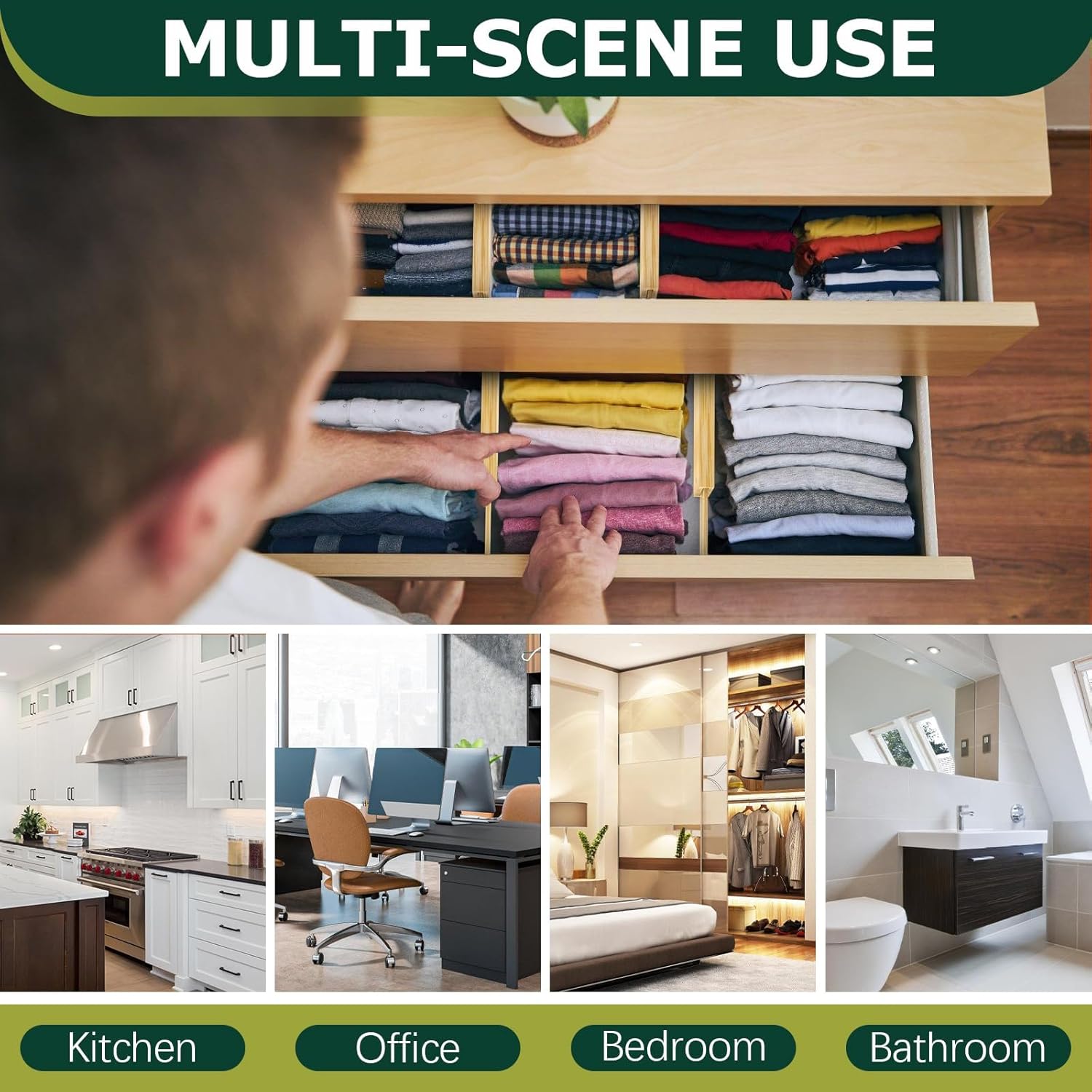 【Usage Scenarios】 With a long length and narrow width, these drawer dividers are ideal for large, shallow drawers at home or office. Perfect for organizing kitchen utensils, clothes, office supplies, cosmetics, bathroom essentials and more. Note: Not recommended for smaller or deeper drawers