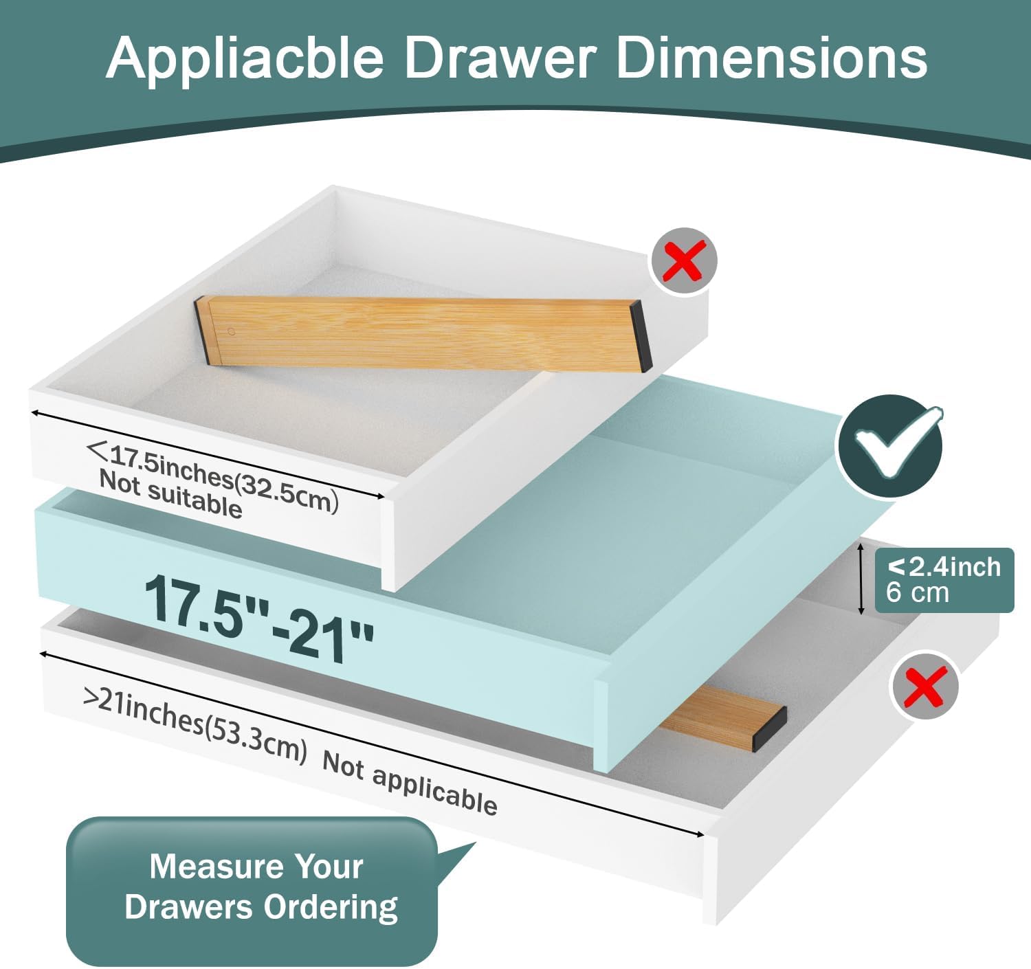 【Recommended Drawer Size】Please measure your drawer before purchasing! This set of bamboo drawer dividers is designed for drawers with an internal height of less than 2.36 inches and a length of 17.5 to 21 inches. If your drawer’s internal height is less than 2.36 inches and its length is either less than 17.5 inches or exceeds 21 inches, it will not work