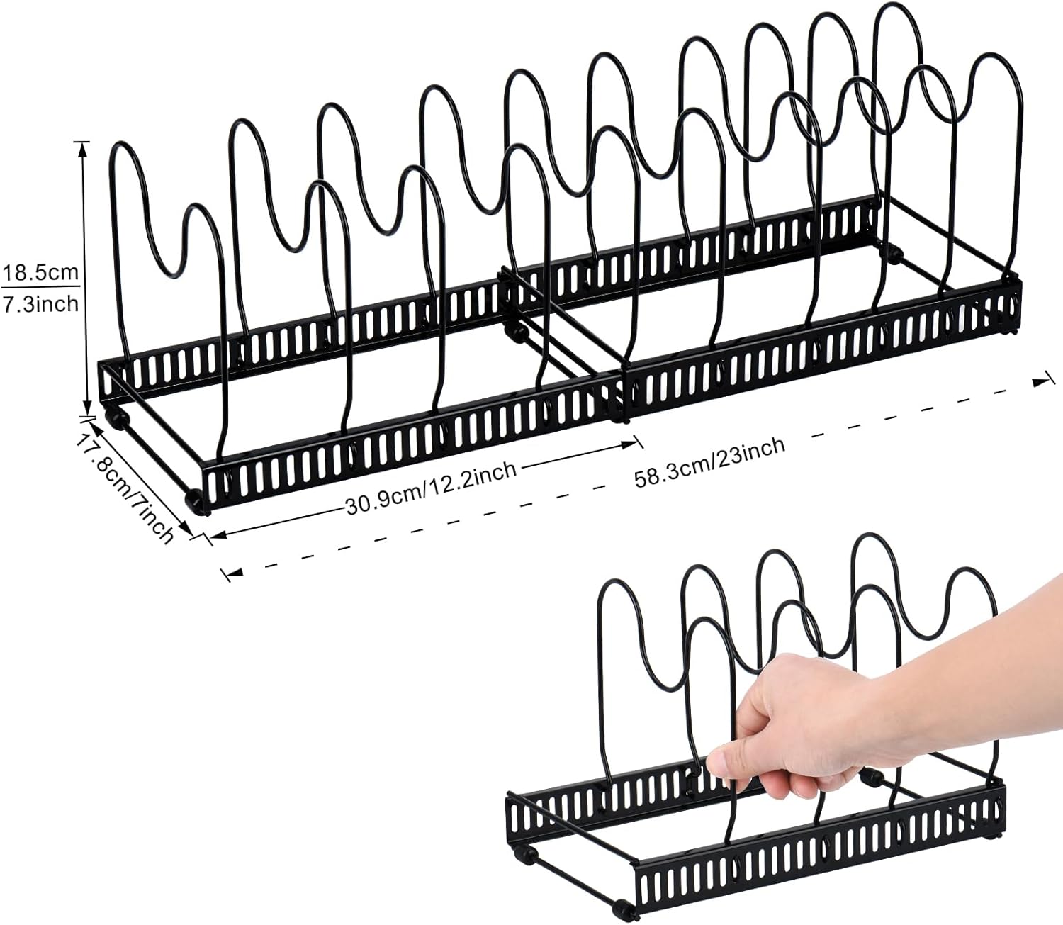 Adjustable Pan Organizer Rack: The pan organizer is suitable for cutting boards, pan, pot and pan lids. You can adjust the pot and pan lids organizer to suit the pots and pans. Suitable for cabinet organize and keep the kitchen well organized. Tip: Please measure your cabinet size and pot size before purchasing