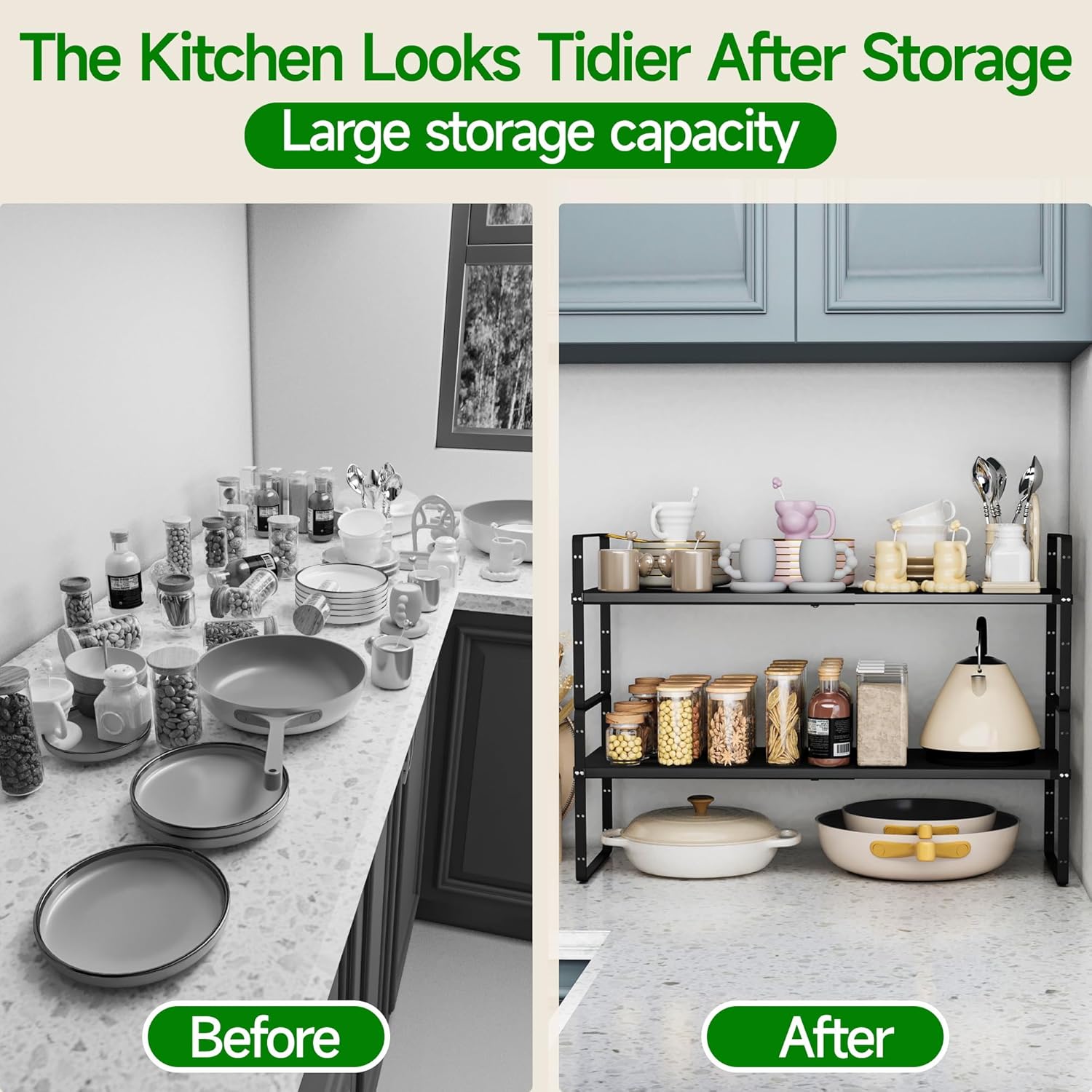 Expandable Cabinet Organizer: The expandable design of the kitchen countertop organizer can adjust the length according to your needs, adapt to different cabinets, countertops and under the kitchen sink, effectively utilize small spaces, and avoid a messy visual experience
