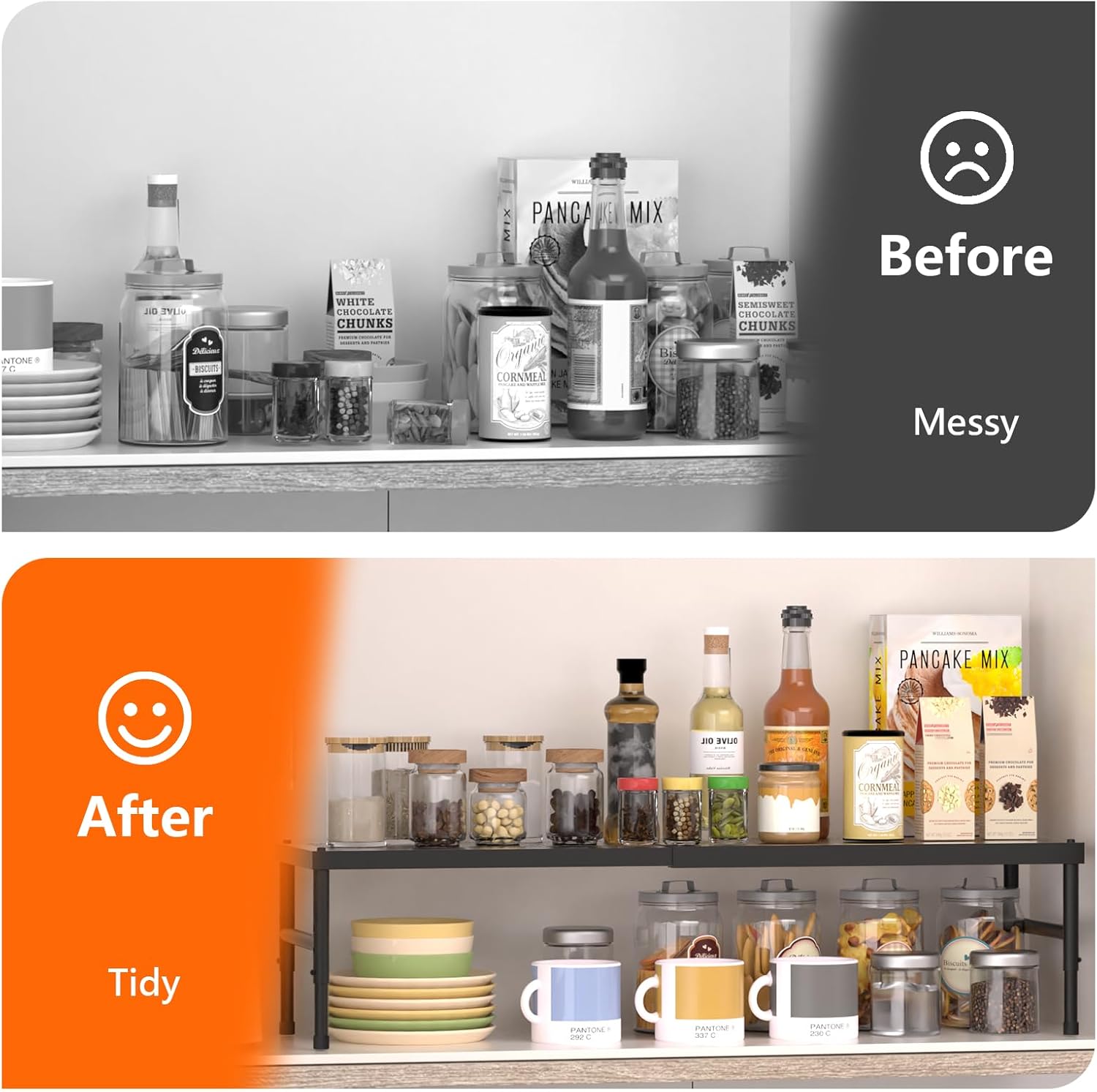 Expandable & Stackable Cabinet Organizer:Designed as a top-tier kitchen organizers and storage solution, this product includes an adjustable pantry shelves system that allows for customization to hold various items securely, coupled with an expandable cabinet shelf that adapts to your needs, serving as an excellent spice rack organizer for cabinet and improving overall cupboard shelf organize capabilities for a tidy kitchen.