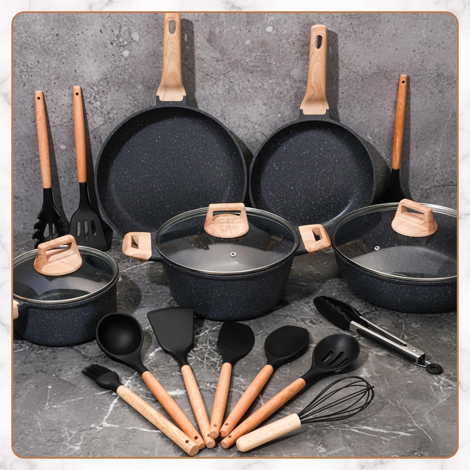 20-Piece Durable Cookware Set: this set includes a 8-inch frying pan, an 10-inch frying pan, a 3-quart suate pan with lid, a 1.8-quart saucepan with lid, a 4.5-quart casserole with lid, a flexible spatula, a pasta spatula, a spatula, tongs, a cooking bucket, and more; The diverse range of tools meets your diverse kitchen needs