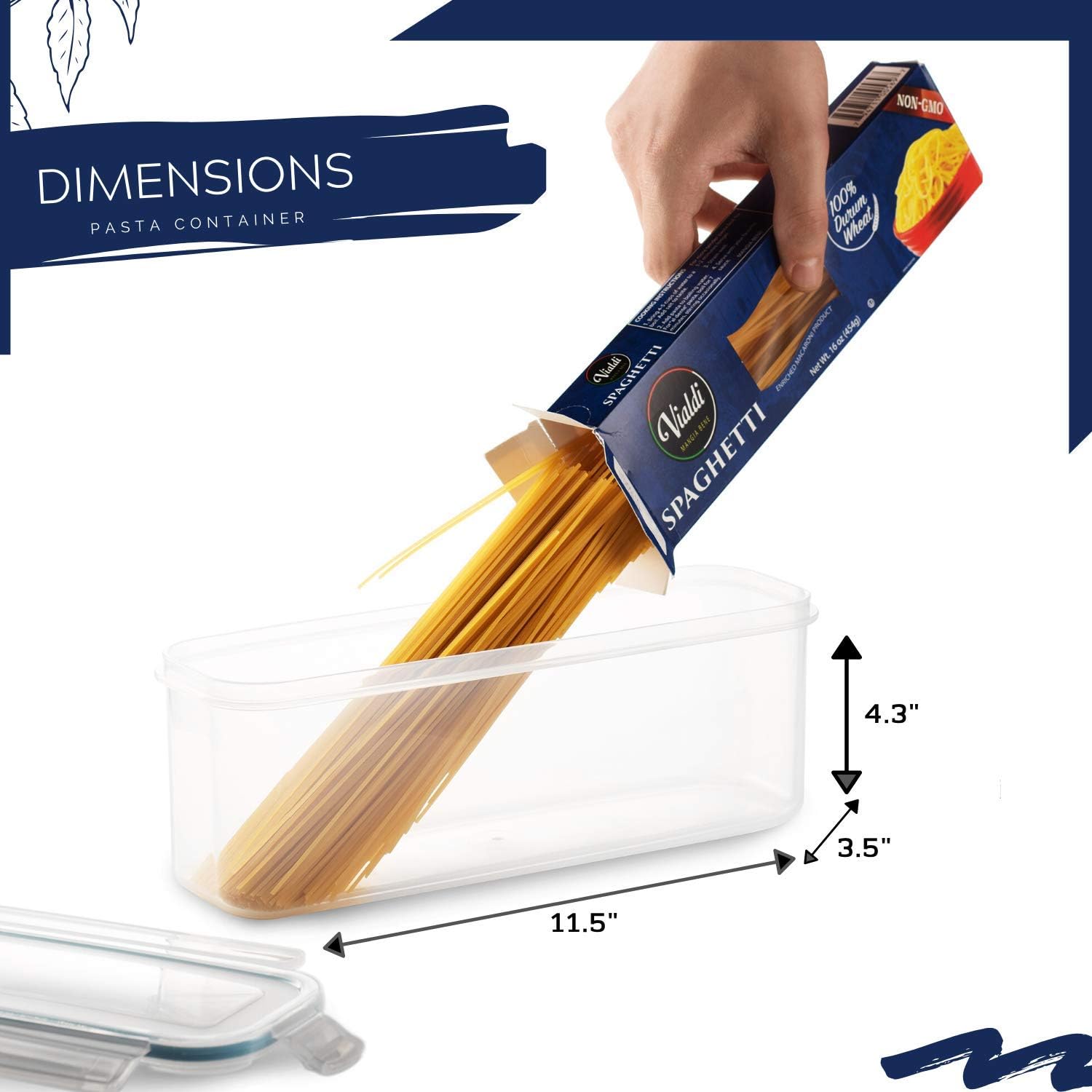 Pasta Container Set (77.8 oz): Get rid of messy plastic noodle bags and savor your fresh pasta using our pasta storage containers for pantry set. This 11.5” airtight storage container set is designed for noodles like spaghetti, lasagna, linguine, macaroni, fusilli, and more.