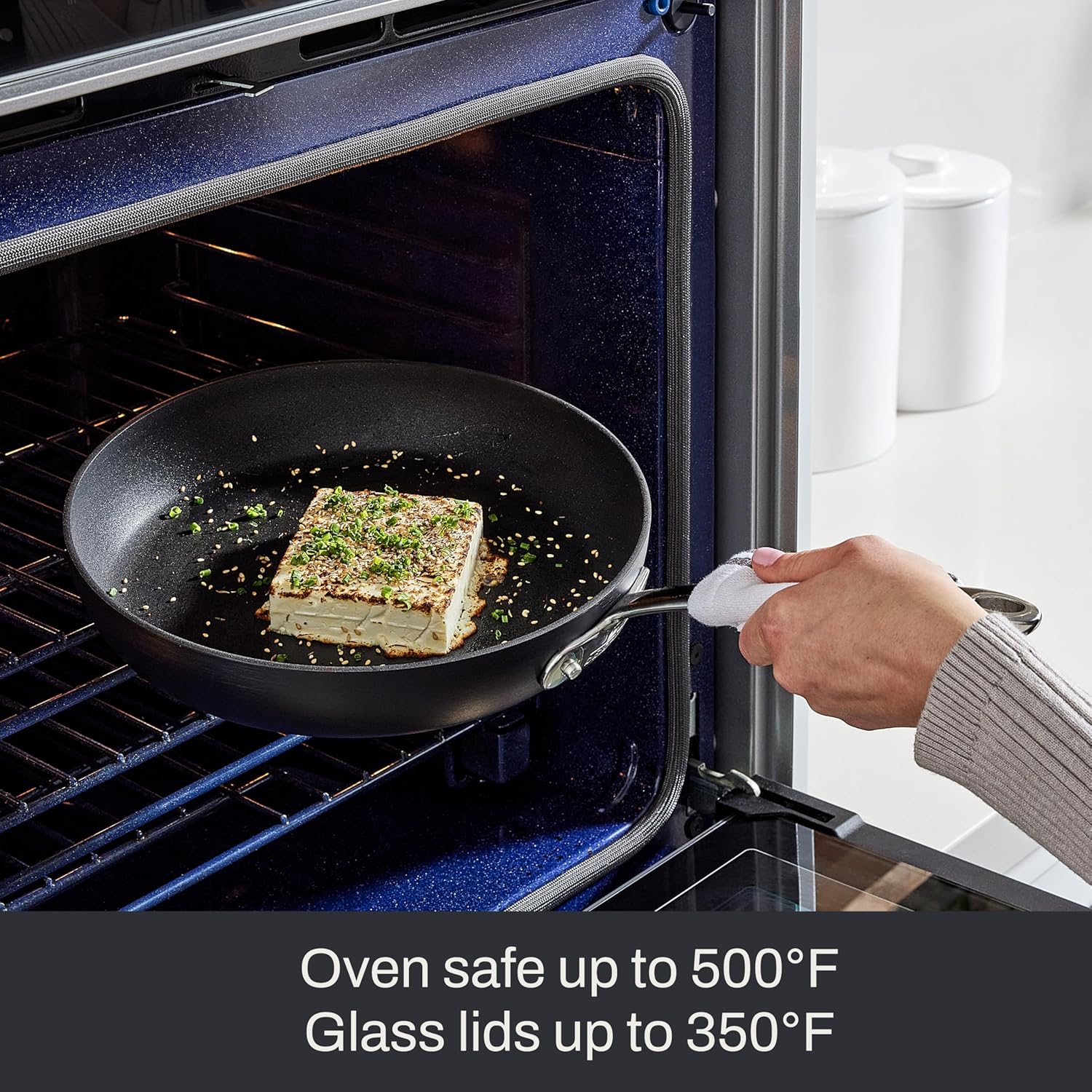Scratch resistant, hard anodized aluminum is reinforced with an optimized stainless-steel base for improved durability, warp resistance and even, consistent heat