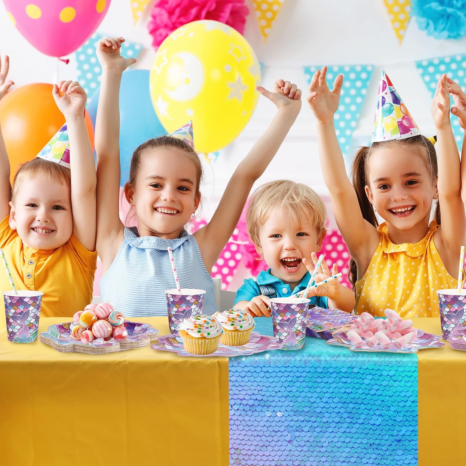 Premium materials: blending functionality with fantasy, our paper plates, cups, and napkins provide reliable performance, while the plastic cutlery withstands the heartiest of feasts. The fabric with plastic sequined table runner adds a sparkling touch, providing your party shines brighter than a mermaid’s tail