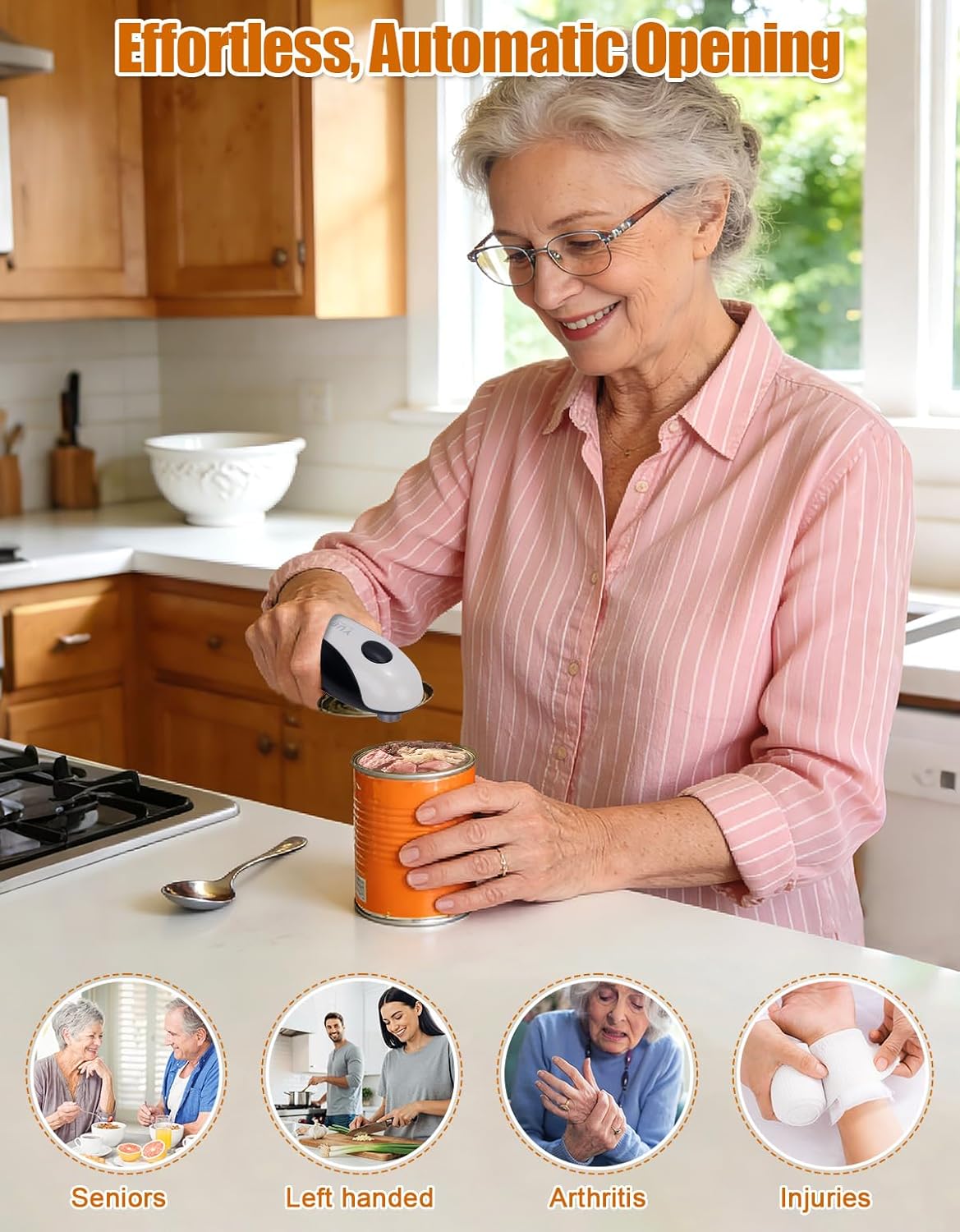 Effortless One-Touch Operation: This innovative electric can opener operates with effortless one-touch automation, requiring just a single press to initiate the 360-degree cutting cycle—completely eliminating manual effort. Its specially angled concealed blade ensures food never contacts the cutting surface, delivering a smooth, safe rim every time. Ideal for seniors with limited hand strength or arthritis, as well as anyone seeking a genuinely hands-free solution(Tip:To stop operation, press the button once more and allow a 2-second pause)