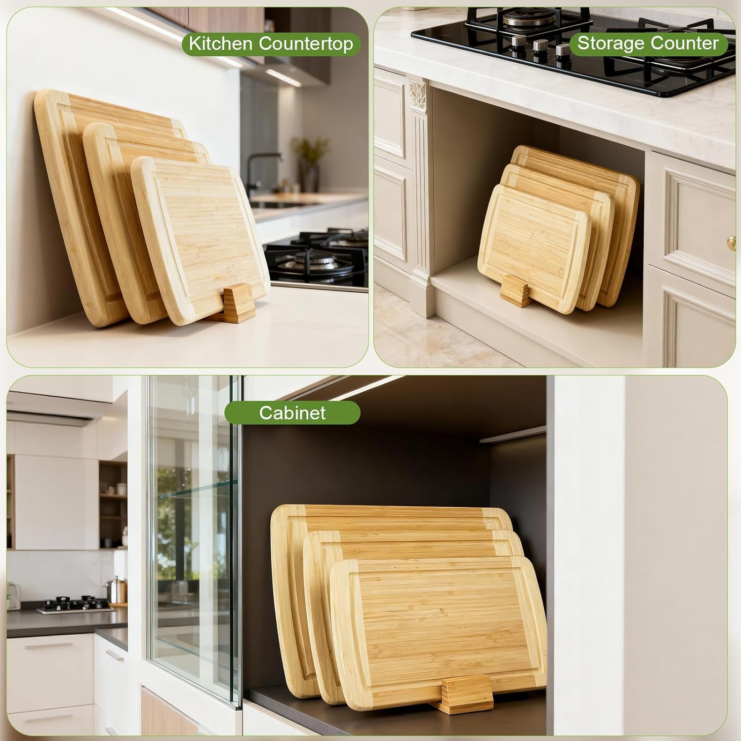 【Material】Crafted from premium bamboo, this cutting board stand resists deformation and is easy to clean